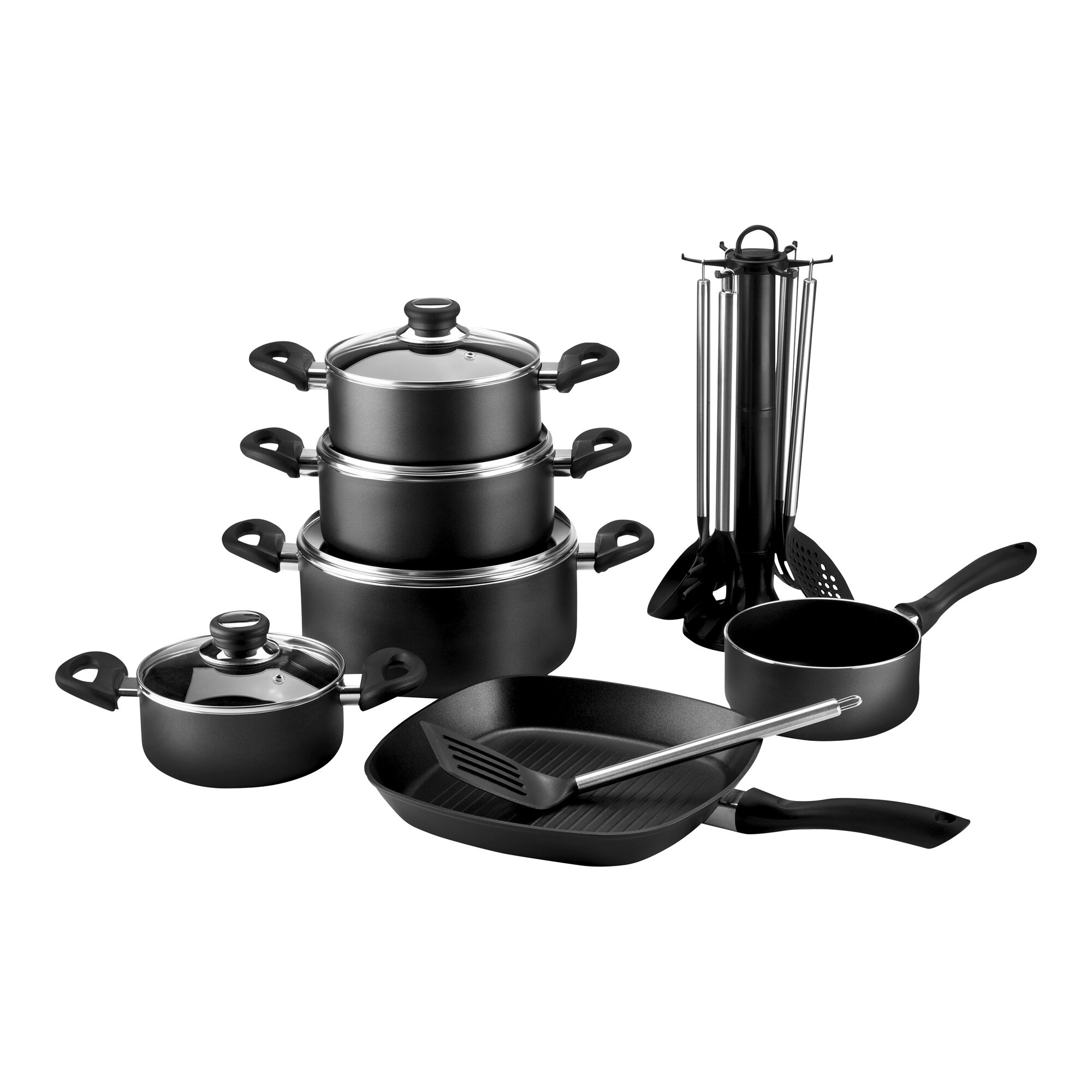 Das 17-teilige Aluguss-Topfset macht gesundes Kochen zum Kinderspiel. Die Töpfe und die Steakpfanne bestehen aus robustem Aluguss und sind mit komfortablen Kunststoffgriffen ausgestattet. Dank der hochwertigen Antihaft-Beschichtung benötigen Sie nur wenig Fett, was Ihre Gerichte besonders gesund macht. Die schwere Qualitätsausführung sorgt für eine optimale Wärmeverteilung und langanhaltende Wärmespeicherung. Die Töpfe sind hitzebeständig bis 180°C (mit Deckel bis 160°C) und spülmaschinenfest, was die Reinigung erleichtert. Zusätzlich enthält das Set sechs praktische Küchenhelfer und einen Ständer, die Ihnen die Zubereitung Ihrer Gerichte erleichtern. Geeignet für alle Herdarten außer Induktion. Set-Inhalt: 1x Fleischtopf mit Glasdeckel Ø ca. 16 cm, Tiefe 9 cm, Inhalt 1,3 Liter; 1x Fleischtopf mit Glasdeckel Ø ca. 18 cm, Tiefe 9 cm, Inhalt 1,6 Liter; 1x Fleischtopf mit Glasdeckel Ø ca. 20 cm, Tiefe 9 cm, Inhalt 2,1 Liter; 1x Fleischtopf mit Glasdeckel Ø ca. 24 cm, Tiefe 11 cm, Inhalt 3,5 Liter; 1x Stieltopf Ø ca. 16 cm, Tiefe 8,5 cm, Inhalt 1,4 Liter; 1x Steakpfanne mit Rillenboden 28×28 cm