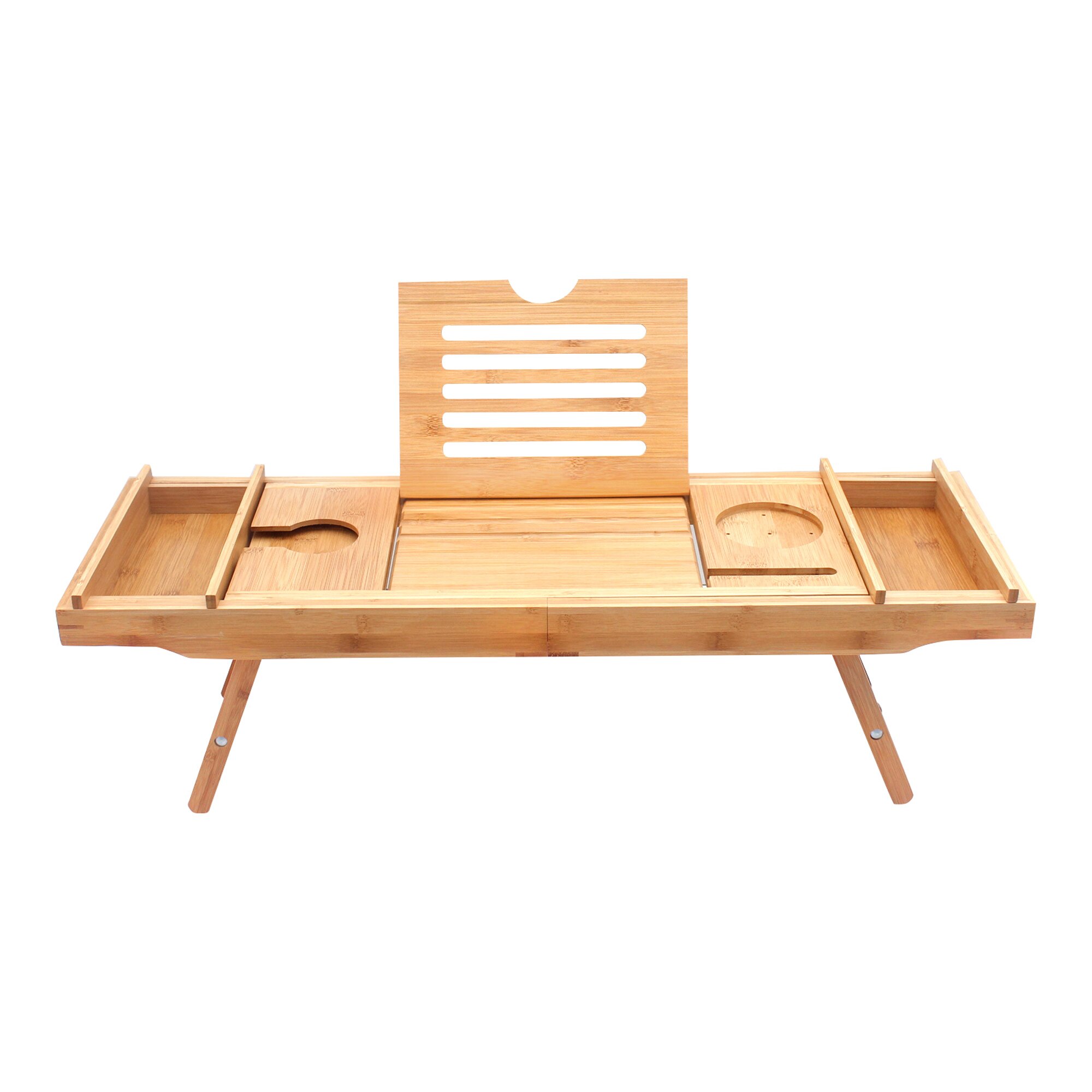 Ab ins Schaumbad? Nicht ohne Lieblings-Utensilien: Buch, Handy oder Tablet können sicher abgestellt werden und die Weinglashalterung, 2 variable Ablagen und 1 Seifenbox runden die Auszeit ab. Dank der ausklappbaren Beine auch als Tisch z.B. auf dem Sofa praktisch. Platzsparend verstaubar.