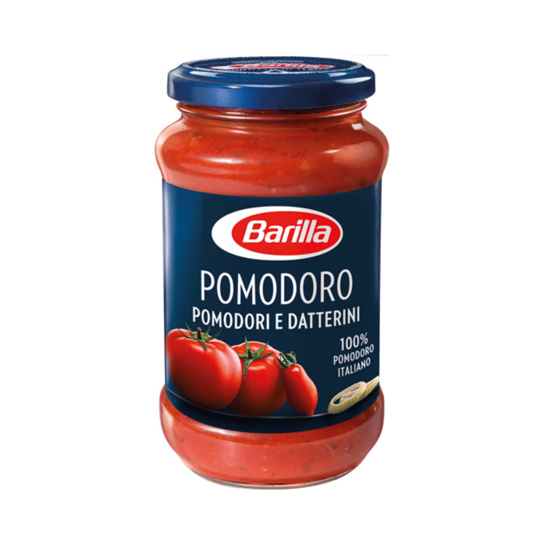 Barilla Sugo Pomodoro Datterini TOMATENSAUCE MIT TOMATEN UND DATTELTOMATEN Netto Füllmenge Bruttogewicht 614.00 Gramm,Nettogehalt 400.00 Gramm Allergene Zutaten ZUTATEN: Tomatenfruchtfleisch 73,9%, Tomatenmarkkonzentrat 12%, passierte Datteltomaten 4%, Sonnenblumenöl, Zwiebeln 2,8%, Zucker, Salz, natürliches Aroma, Knoblauch, schwarzer Pfeffer. Nährwerte pro 100g Unzubereitet 100 Gramm, Energie 290,00 kJ, Energie 69,00 kcal, Fett 3,40 g, davon gesättigte Fettsäuren 0,40 g, Kohlenhydrate 7,30 g, davon Zucker 5,60 g, Ballaststoffe 1,40 g, Eiweiß 1,80 g, Salz 1,00 g Ursprungsland ITALIEN Marke BARILLA Hersteller Name: Barilla G. e R. Fratelli S.p.A.,Adresse: Via Mantova 166, Parma – Italy
