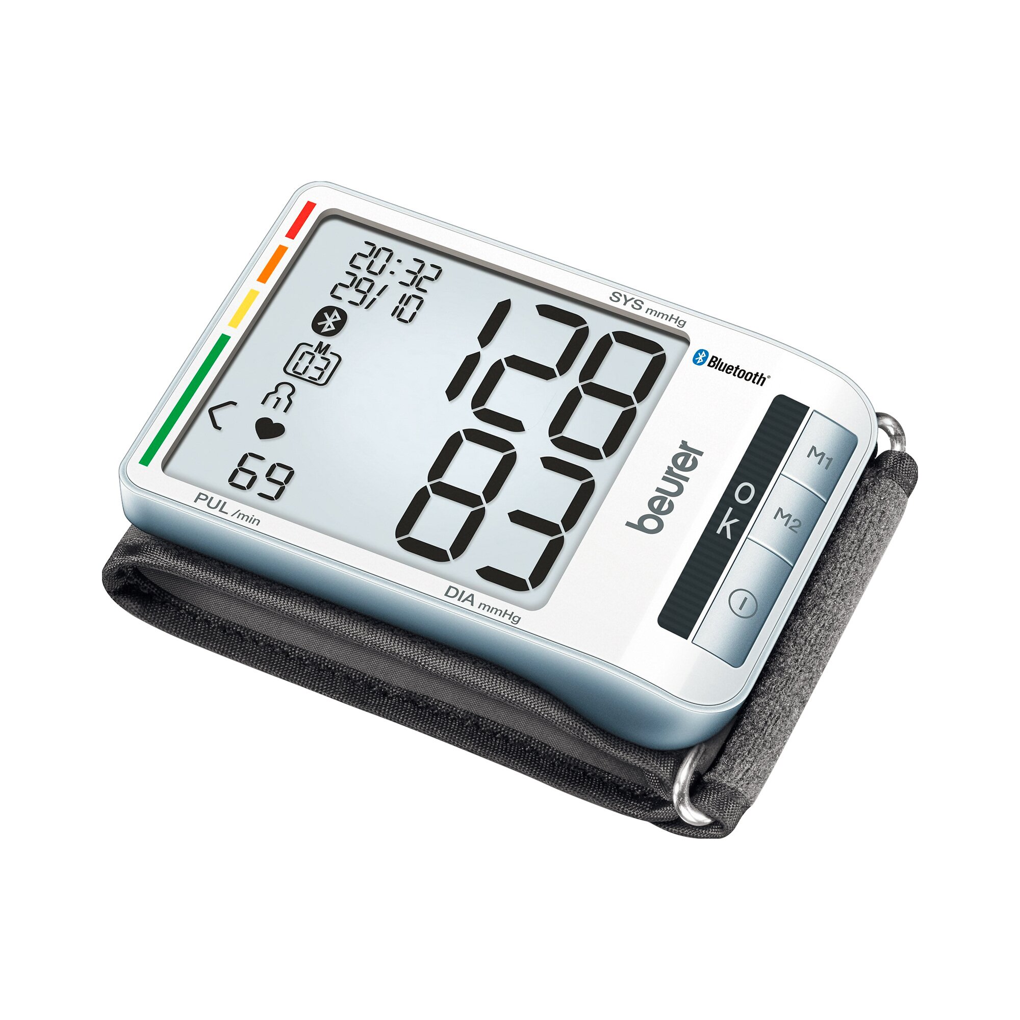 Das Handgelenk-Blutdruckmessgerät BC 85 bietet Ihnen eine komfortable und genaue Überwachung Ihres Blutdrucks. Es misst automatisch am Handgelenk, errechnet Durchschnittswerte der letzten 7 Tage und meldet Anwendungsfehler. Mit Bluetooth® können Sie die Werte direkt auf Ihr Smartphone übertragen. Das Gerät verfügt über eine Arrhythmie-Erkennung, 2x 60 Speicherplätze und eine Anzeige für die korrekte Position. Es ist geeignet für Handgelenksumfänge von 13,5 bis 23 cm. Inklusive Aufbewahrungsbox.