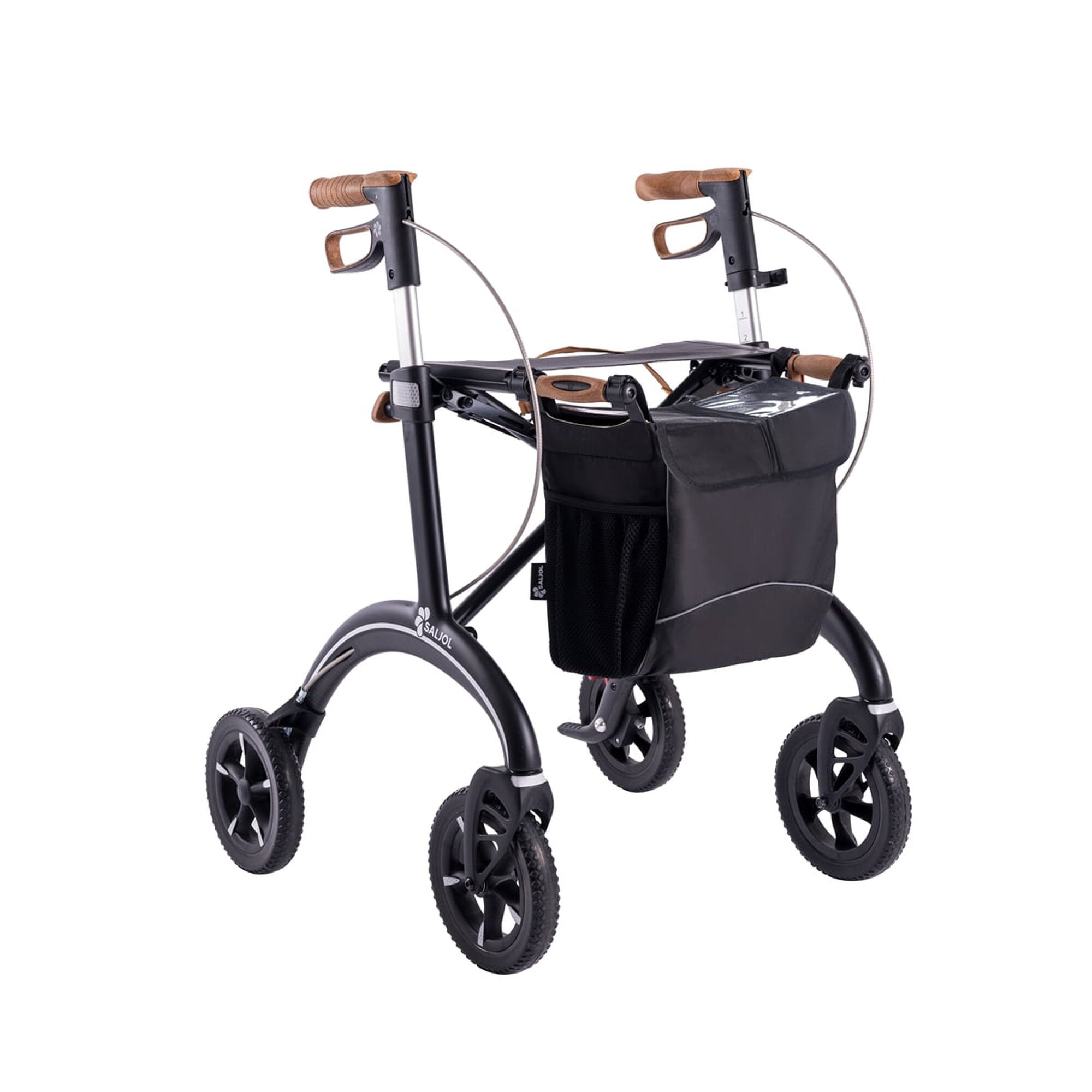 Erleben Sie die Revolution in Mobilität mit dem Saljol Carbon Rollator CR54. Dieses Meisterwerk vereint edles Design, herausragenden Komfort und federleichte Handhabung. Mit nur 5,6 kg ist er ultraleicht und faltbar für mühelosen Transport.Der CR54 besticht durch stoßabsorbierende Reifen und ergonomische Korkgriffe. Diese bieten nicht nur festen Halt, sondern ermöglichen auch sicheres Schieben und Stützen. Ideal für den täglichen Einsatz, innen wie außen, dank leichtgängiger Gummierung auf Asphalt und effizienter Federung auf unbefestigten Wegen. In der Wohnung überzeugt der CR54 mit Wendigkeit und Stabilität.Die zahlreichen Reflektoren gewährleisten höchste Sichtbarkeit bei Dunkelheit. Zusätzlich ist im Lieferumfang eine praktische Tasche enthalten, die perfekt für die wöchentlichen Einkäufe geeignet ist. Die weichen Räder überwinden spielend Holperstrecken, und der weiche Rollatorsitz lädt zu entspannten Pausen ein. Leichtgängige Bremsgriffe erleichtern das Parken und Verladen, und das geringe Packmaß macht ihn zu einem unkomplizierten Reisebegleiter – sei es bei Autofahrten oder Flugreisen. Entdecken Sie eine neue Dimension der Mobilität – mit dem Saljol Carbon Rollator CR54.