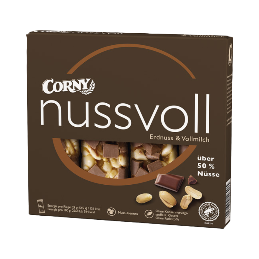 Corny nussvoll Erdnuss & Vollmilchschokolade Müsliriegel UTZ, 4 Stück, 96g Der volle Nuss-Genuss in der klassischen Variante mit knackigen Erdnüssen und Vollmilchschokolade. Erdnuss-Vollmilchschokoladen-Riegel Netto Füllmenge Bruttogewicht 120.00 Gramm,Nettogehalt 96.00 Gramm Allergene Kann Spuren enthalten von Nüsse und Nusserzeugnisse. Kann Mandeln, Haselnüsse, Walnüsse, Cashewnüsse etc. einschliessen,Enthält – Ist im Produkt enthalten Milch und Milcherzeugnisse,Glutenhaltiges Getreide sowie daraus hergestellte Erzeugnisse,Erdnüsse und -erzeugnisse Aufbewahrung Vor Wärme schützen. Kühl und trocken lagern. Zutaten Zutaten: Geröstete ERDNÜSSE 59%, Glukosesirup, Glukose-Fruktose-Sirup, VOLLMILCHSCHOKOLADENSTÜCKE 10% (Zucker, Kakaomasse, VOLLMILCHPULVER, Kakaobutter, Emulgator Lecithine), VOLLKORNWEIZEN-Crispies (WEIZENVOLLKORNMEHL, WEIZENGLUTEN, GERSTENMALZEXTRAKT), Kokosfett, Karamellzuckersirup, Stabilisator Glycerin, Emulgator Lecithine, Salz. Nährwerte pro 100g Unzubereitet 1 Portion, Energie 131,00 kcal, Energie 545,00 kJ, Fett 8,20 g, davon gesättigte Fettsäuren 2,20 g, Kohlenhydrate 9,50 g, davon Zucker 4,90 g, Ballaststoffe 1,40 g, Eiweiß 4,10 g, Salz 0,05 g , Unzubereitet 100 Gramm, Energie 2.268,00 kJ, Energie 544,00 kcal, Fett 34,20 g, davon gesättigte Fettsäuren 9,00 g, Kohlenhydrate 39,40 g, davon Zucker 20,60 g, Ballaststoffe 5,90 g, Eiweiß 17,20 g, Salz 0,22 g Ursprungsland DEUTSCHLAND, BUNDESREPUBLIK Marke CORNY Hersteller Name: Schwartauer Werke GmbH & Co. KGaA,Adresse: 23608 Bad Schwartau