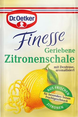 Dr. Oetker Finesse Zitronenschale gerieben Dr. Oetker Finesse Geriebene Zitronenschale ist eine gelungene Alternative gegenüber der Verwendung von frischen Früchten. Backwaren und Desserts aller Art, die Sie mit Dr. Oetker Finesse Geriebene Zitronenschale aromatisieren, werden zu einem erlesenen Geschmackserlebnis! Ein Beutel ist ausreichend für 250 g Mehl oder 500 ml Flüssigkeit. Geriebene Zitronenschale mit Dextrose, stabilisiert Netto Füllmenge Bruttogewicht 21,892 Gramm,Nettogehalt 18.00 Gramm Aufbewahrung Trocken und nicht über Zimmertemperatur lagern Zutaten 60% Dextrose, 36% zerkleinerte teilentwässerte Zitronenschalen, 1,4% Zitronenöl, Trennmittel (E 341), Antioxidationsmittel (E 300, E 304), Konservierungsstoff (E 200), Aroma, Farbstoff (E 101). Nährwerte pro 100g Energie Ungefährer Wert (~) 1263 Kilojoule Energie Ungefährer Wert (~) 298 Kilokalorie Fett Ungefährer Wert (~) 0,1 Gramm davon gesättigte Fettsäuren Ungefährer Wert (~) 0 Gramm Kohlenhydrate Ungefährer Wert (~) 67 Gramm davon Zucker Ungefährer Wert (~) 67 Gramm Ballaststoffe Ungefährer Wert (~) 9,9 Gramm Eiweiß Ungefährer Wert (~) 0,7 Gramm Salz Ungefährer Wert (~) 0,01 Gramm Ursprungsland DEUTSCHLAND, BUNDESREPUBLIK Verwendung Sieden – Zubereitung der Speise in kochendem Wasser 1. Puddingpulver mit etwa 2 geh. EL (40 g) Zucker mischen. Nach und nach mit mind. 6 EL von 500 ml kalter Milch glatt rühren. 2. Übrige Milch aufkochen, vom Herd nehmen und angerührtes Pulver mit einem Schneebesen einrühren. 3. Pudding unter Rühren mind. 1 Min. kochen. Pudding in eine Schale oder kalt ausgespülte Sturzform füllen. Zum Stürzen mind. 4 Std. in den Kühlschrank stellen. Marke DR.OETKER Hersteller DR. OETKER GMBH,Adresse: Ringmauergasse 9/1, 9500 Villach, Österreich