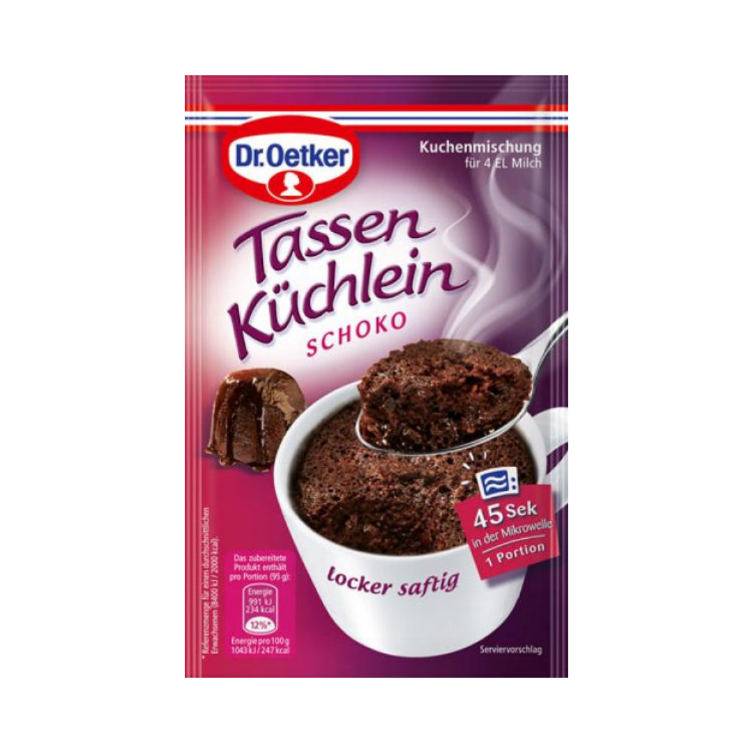 Dr. Oetker Tassenküchlein Schoko Einfach mit Milch in einer Tasse anrühren, 45 Sekunden in der Mikrowelle backen und fertig ist die Kuchenportion für Zwischendurch und Jedermann. Kuchenmischung für 1 Schoko Küchlein Netto Füllmenge Nettogehalt 55.00 Gramm,Bruttogewicht 58.531 Gramm Allergene Kann Spuren enthalten von Nüsse und Nusserzeugnisse. Kann Mandeln, Haselnüsse, Walnüsse, Cashewnüsse etc. einschliessen,Enthält – Ist im Produkt enthalten Eier und -erzeugnisse,Glutenhaltiges Getreide sowie daraus hergestellte Erzeugnisse,Milch und Milcherzeugnisse Zutaten Zutaten: Zucker, WEIZENMEHL, 9,0% Schokolade (Zucker, Kakaomasse, fettarmes Kakaopulver, Kakaobutter, Emulgator (Lecithine)), 6,5% fettarmes Kakaopulver, HÜHNEREIEIWEISSPULVER, modifizierte Stärke, Emulgatoren (E 472b, E 472a), Backpulver (Backtriebmittel Dinatriumdiphosphat, Natriumhydrogencarbonat), Glukosesirup, MAGERMILCHPULVER, Aroma Vanillin. Kann Spuren von HASELNÜSSEN enthalten. Nährwerte pro 100g Zubereitet 100 Gramm, Energie 1.043,00 kJ, Energie 247,00 kcal, Fett 3,40 g, davon gesättigte Fettsäuren 2,10 g, Kohlenhydrate 46,00 g, davon Zucker 34,00 g, Eiweiß 6,20 g, Salz 0,46 g Ursprungsland DEUTSCHLAND, BUNDESREPUBLIK Verwendung Zubereitung unter Benutzung von Mikrowellen 1. 4 EL Milch in eine Kaffeetasse geben. Pulver hinzufügen und sofort vorsichtig verrühren, bis sich das Pulver gelöst hat. 2. Tasse in die Mikrowelle stellen (600 Watt: 60 Sek. oder 800 Watt: 45 Sek.), Küchlein warm genießen. Hinweis: Der Kuchen behält einen kleinen Anteil Soße, der mit der Zubereitungszeit und der Leistung der Mikrowelle variiert. Tipp: Sie können das Küchlein auch auf einen Teller stürzen, evt. mit einem Messer vorsichtig vom Rand lösen. Marke DR.OETKER Hersteller Name: DR. OETKER GMBH,Adresse: Ringmauergasse 9/1, 9500 Villach, Österreich