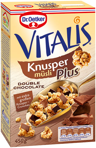 Dr. Oetker Vitalis Knusper Müsli Plus Double Chocolate, 450 Gramm In Vitalis Knusper Plus Double Chocolate verbinden sich goldbraun geröstete Knusper-Crunchies mit knackiger Vollmilch- und edler Zartbitter-Schokolade zu einem besonderen Knuspererlebnis. Knuspermüsli mit Vollmilch- und feinherber Schokolade Füllhöhe technisch bedingt. Netto Füllmenge Bruttogewicht 499.854 Gramm,Nettogehalt 450.00 Gramm Allergene Kann Spuren enthalten von Sojabohnen und -erzeugnisse,Nüsse und Nusserzeugnisse. Kann Mandeln, Haselnüsse, Walnüsse, Cashewnüsse etc. einschliessen,Enthält – Ist im Produkt enthalten Milch und Milcherzeugnisse,Glutenhaltiges Getreide sowie daraus hergestellte Erzeugnisse Aufbewahrung Bitte den Innenbeutel nach dem Öffnen wieder gut verschließen. Zutaten Zutaten: 47% Vollkorn-HAFERFLOCKEN, Sonnenblumenöl, Zucker, 8,0% Schokolade (Kakaomasse, Zucker, fettarmer Kakao, Kakaobutter, Emulgator (Lecithine)), 7,0% VOLLMILCHSCHOKOLADE (Zucker, VOLLMILCHPULVER, Kakaomasse, Kakaobutter, SÜSSMOLKENPULVER, Emulgator (Lecithine)), Glukosesirup, getrocknete WEIZENKEIME, WEIZENMEHL, Reismehl, Honig, WEIZENVOLLKORNMEHL, Salz, getrockneter GERSTENMALZEXTRAKT, MAGERMILCHPULVER, Aroma. Kann enthalten: SOJA, MANDELN, HASELNÜSSE, CASHEWKERNE, PEKANNÜSSE. Nährwerte pro 100g Unzubereitet 100 Gramm, Energie 2.000,00 kJ, Energie 478,00 kcal, Fett 21,00 g, davon gesättigte Fettsäuren 4,80 g, Kohlenhydrate 59,00 g, davon Zucker 23,00 g, Ballaststoffe 7,20 g, Eiweiß 10,00 g, Salz 0,57 g, Magnesium 81,60 mg Gütezeichen Füllhöhe technisch bedingt. Ursprungsland DEUTSCHLAND, BUNDESREPUBLIK Marke DR.OETKER Hersteller Name: DR. OETKER GMBH,Adresse: Ringmauergasse 9/1, 9500 Villach, Österreich