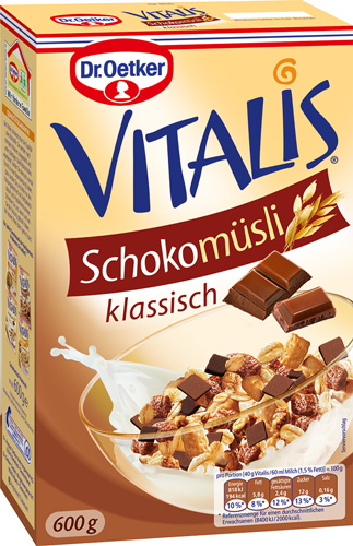 Dr. Oetker Vitalis Schokomüsli Klassisch, 600 Gramm Mit Vitalis Knusper Schoko knuspert das Frühstück so richtig schoko-lecker. Kein Wunder, schließlich enthält es nicht nur knackige Knusper-Crunchies, die aus Haferflocken, Cornflakes, Reiscrisp und Kakao gebacken sind, sondern auch Vollmilch Schokostückchen und karamelisierte Mandelstückchen. Und das in der original Vitalis-Knusperqualität. Schokomüsli klassisch Füllhöhe technisch bedingt. Netto Füllmenge Bruttogewicht 649.00 Gramm,Nettogehalt 600.00 Gramm Allergene Kann Spuren enthalten von Sojabohnen und -erzeugnisse,Enthält – Ist im Produkt enthalten Milch und Milcherzeugnisse,Glutenhaltiges Getreide sowie daraus hergestellte Erzeugnisse,Nüsse und Nusserzeugnisse. Kann Mandeln, Haselnüsse, Walnüsse, Cashewnüsse etc. einschliessen Aufbewahrung Bitte den Innenbeutel nach dem Öffnen wieder gut verschließen. Zutaten Zutaten: 60% Vollkorn-HAFERFLOCKEN, 13% Schokolade (Zucker, Kakaomasse, Kakaobutter, Emulgator (Lecithine)), 10% VOLLMILCHSCHOKOLADE (Zucker, VOLLMILCHPULVER, Kakaomasse, Kakaobutter, SÜSSMOLKENPULVER, Emulgator (Lecithine)), Zucker, WEIZENVOLLKORNMEHL, 3,0% karamellisierte und aromatisierte MANDELSTÜCKCHEN (MANDELSTÜCKE, Zucker, Kokosfett, Karamellzucker, Aroma), Reismehl, Sonnenblumenöl, WEIZENMEHL, fettarmes Kakaopulver, Glukosesirup, getrockneter GERSTENMALZEXTRAKT, WEIZENGLUTEN, MAGERMILCHPULVER, Cornflakes (Mais, Zucker, Salz, GERSTENMALZEXTRAKT), Salz, Karamellzucker, Aroma. Kann enthalten: weitere SCHALENFRÜCHTE (NÜSSE), SOJA. Nährwerte pro 100g Unzubereitet 100 Gramm, Energie 1.751,00 kJ, Energie 417,00 kcal, Fett 12,00 g, davon gesättigte Fettsäuren 4,80 g, Kohlenhydrate 61,00 g, davon Zucker 21,00 g, Ballaststoffe 8,00 g, Eiweiß 11,00 g, Salz 0,13 g, Magnesium 86,00 mg Gütezeichen Füllhöhe technisch bedingt. Ursprungsland DEUTSCHLAND, BUNDESREPUBLIK Marke DR.OETKER Hersteller Name: DR. OETKER GMBH,Adresse: Ringmauergasse 9/1, 9500 Villach, Österreich