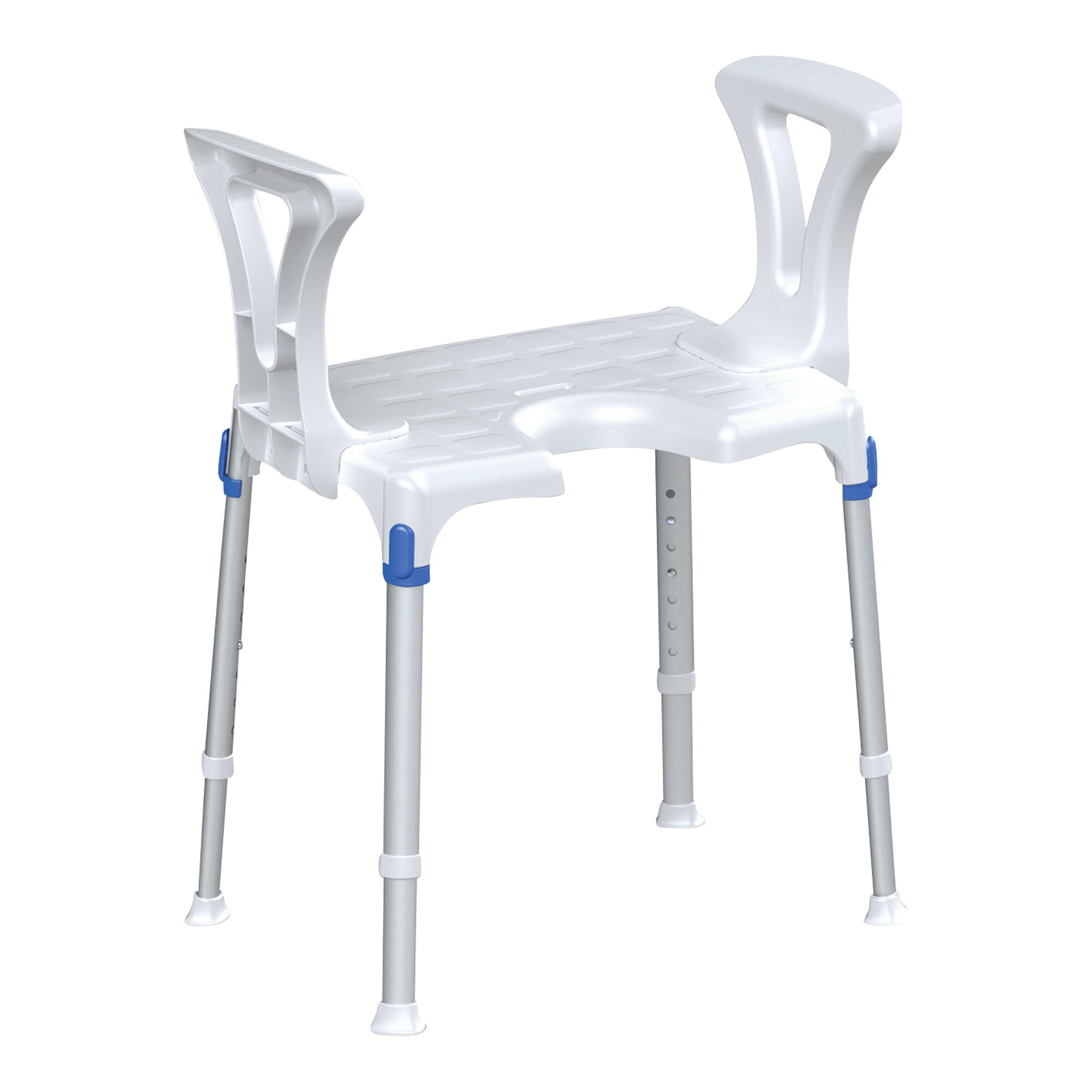 Der Duschhocker aus der Serie laguna vereint schickes Design mit höchster Qualität und Flexibilität. Der Hygieneausschnitt erleichtert die Körperpflege. Zusätzliche Unterstützung beim Hinsetzen und Aufstehen bieten die Armlehnen. Diese zeichnen sich durch ihre angenehm breite Auflagefläche sowie die werkzeuglose, sehr einfache Montage aus.Maße:Stellfläche (L x B): 52,5 x 39 cm – Höhenverstellbarkeit: 39–54 cm (7-fach)Armlehnen (L x H x T): 26 x 23 x 6 cmBreite zwischen den Armlehnen: 46,4 cm