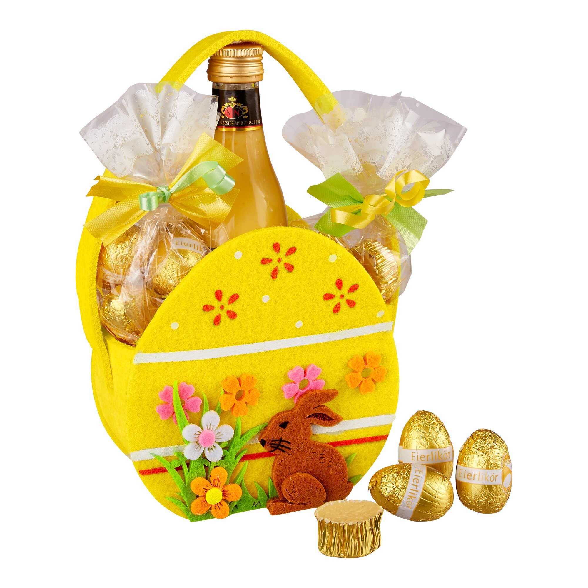 Leckere Oster-Spezialitäten! Machen Sie sich und Ihren Liebsten mit diesem Präsent-Körbchen eine Freude! Darin enthalten sind: 1 Flasche Eierlikör „Nord-Gold“ (10 ml, 14 % Vol.), 48 g Eierlikör-Eier aus Zartbitter-Schokolade und 30 g Eiscups-Konfekt mit Eierlikör, jeweils hübsch verpackt.