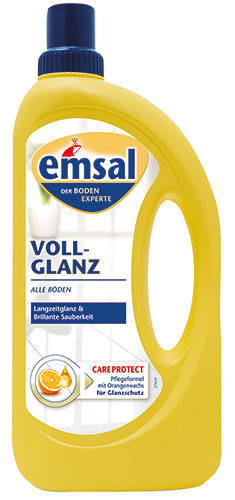 emsal Voll-Glanz Bodenpflege, für alle Böden, 1L Pflege-Reiniger mit Langzeitglanz, sorgt mit seiner Orangenwachs-Pflegeformel für perfekte Sauberkeit, lang anhaltenden Glanz ohne Nachpolieren und frischen Orangenduft. Dazu wird ein widerstandsfähiger Schutz vor Absatzstrichen, Kratzern und Wiederanschmutzung erreicht. Ist für die laufende Reinigung und nachhaltige Pflege aller wasserfesten Böden geeignet. Netto Füllmenge Bruttogewicht 1078.00 Gramm,Nettogehalt 1000.00 Milliliter Allergene Ursprungsland DEUTSCHLAND, BUNDESREPUBLIK Marke EMSAL Hersteller Name: Erdal GmbH,Adresse: Neualmerstrasse 13