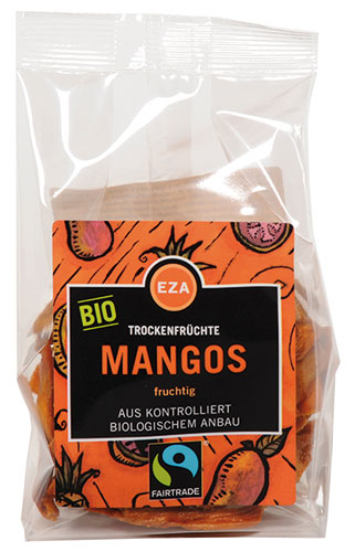 EZA Fairtrade Bio Mangos, getrocknet, 100 Gramm Getrocknete Mangos aus kontrolliert biologischem Anbau. Unter Schutzatmosphäre verpackt. Netto Füllmenge Bruttogewicht 110.00 Gramm,Nettogehalt 100.00 Gramm Allergene Kann Spuren enthalten von Nüsse und Nusserzeugnisse. Kann Mandeln, Haselnüsse, Walnüsse, Cashewnüsse etc. einschliessen,Erdnüsse und -erzeugnisse Aufbewahrung Trocken aufbewahren, vor Wärme schützen. Zutaten Kann Spuren von Schalenfrüchten (Nüssen) und Erdnüssen enthalten. Mangos: Fairtrade-zertifiziert und von Fairtrade ProduzentInnen angebaut. Gesamtanteil: 100%, u.a. von unserer Partnerorganisation gebana Afrique (Burkina Faso). Nährwerte pro 100g Unzubereitet 100 Gramm, Energie 1.425,00 kJ, Energie 337,00 kcal, Fett 1,20 g, davon gesättigte Fettsäuren 0,30 g, Kohlenhydrate 70,00 g, davon Zucker 56,00 g, Eiweiß 3,40 g, Salz 0,00 g Gütezeichen Unter Schutzatmosphäre verpackt. Hersteller Name: EZA Fairer Handel GmbH,Adresse: Wenger Strasse 5, A-5203 Köstendorf,Webseite: www.eza.cc,Telefon: +43 (0)6216 – 20 200