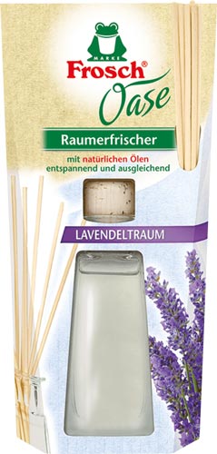 Frosch Oase Raumerfrischer Lavendeltraum, ORIGINAL (Duftflasche) 90ml Glasflakon mit natürlichen Ölen & 6 saugfähigen Rattanstäbchen, Duftnote Lavendel. Netto Füllmenge Bruttogewicht 361.00 Gramm,Nettogehalt 90.00 Milliliter Allergene Zutaten Duftstoffe, natürliche Öle Ursprungsland ÖSTERREICH Marke FROSCH Hersteller Name: Erdal GmbH,Adresse: A-5400 Hallein, Neualmerstrasse 13