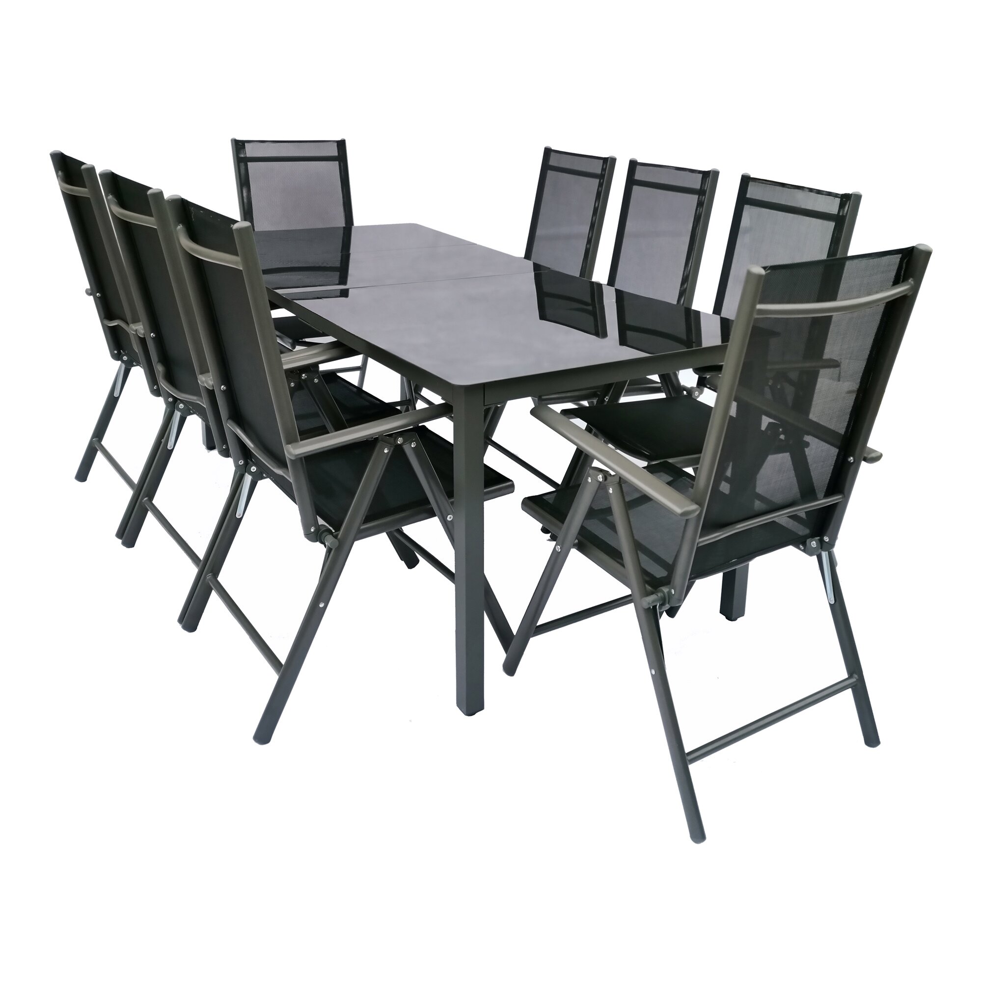 Die textilene Sitzgruppe wird mit einem Tisch und bequemen Klappstühlen geliefert. Die Möbel bestehen aus sehr hochwertigem Aluminium und sind damit äußerst wetter- und UV-beständig. Der robuste Tisch hat eine Platte (bestehend aus 4 Einzelplatten) aus Sicherheitsglas. Armlehnen und verstellbare Rückenlehnen spenden zusätzlichen Komfort. Bei Nichtgebrauch können die Stühle platzsparend zusammengeklappt werden. Maße:Tisch HxBxT ca. : 73 x 190 x 90 cmStuhl HxBxT ca. : 105 x 56 x 65 cm