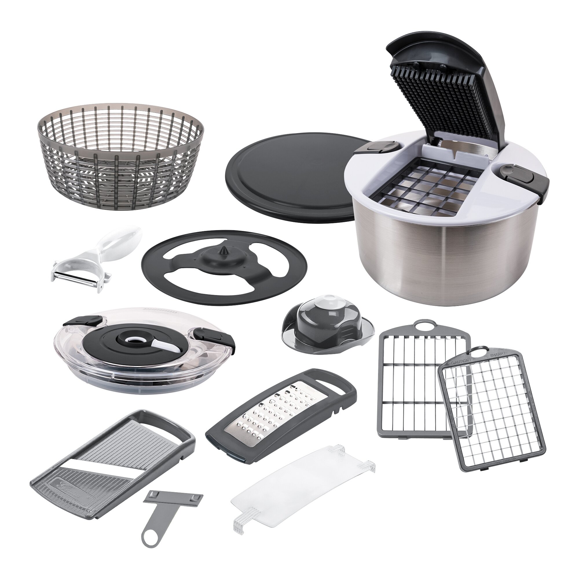 Erleben Sie mit dem Nicer Dicer Family die Revolution in Ihrer Küche! Dieses innovative Schneidgerät vereint eine integrierte Salatschleuder mit einer hochwertigen Edelstahlschüssel. Der praktische Schleuderdeckel mit Wasserablauf-System und Schleudersieb ermöglicht müheloses Trockenschleudern von Salat, Gemüse und vielem mehr. Mit seinem extra großen Messereinsatz ist er vielseitig einsetzbar und macht das Zubereiten Ihrer Lieblingsgerichte zum Kinderspiel.