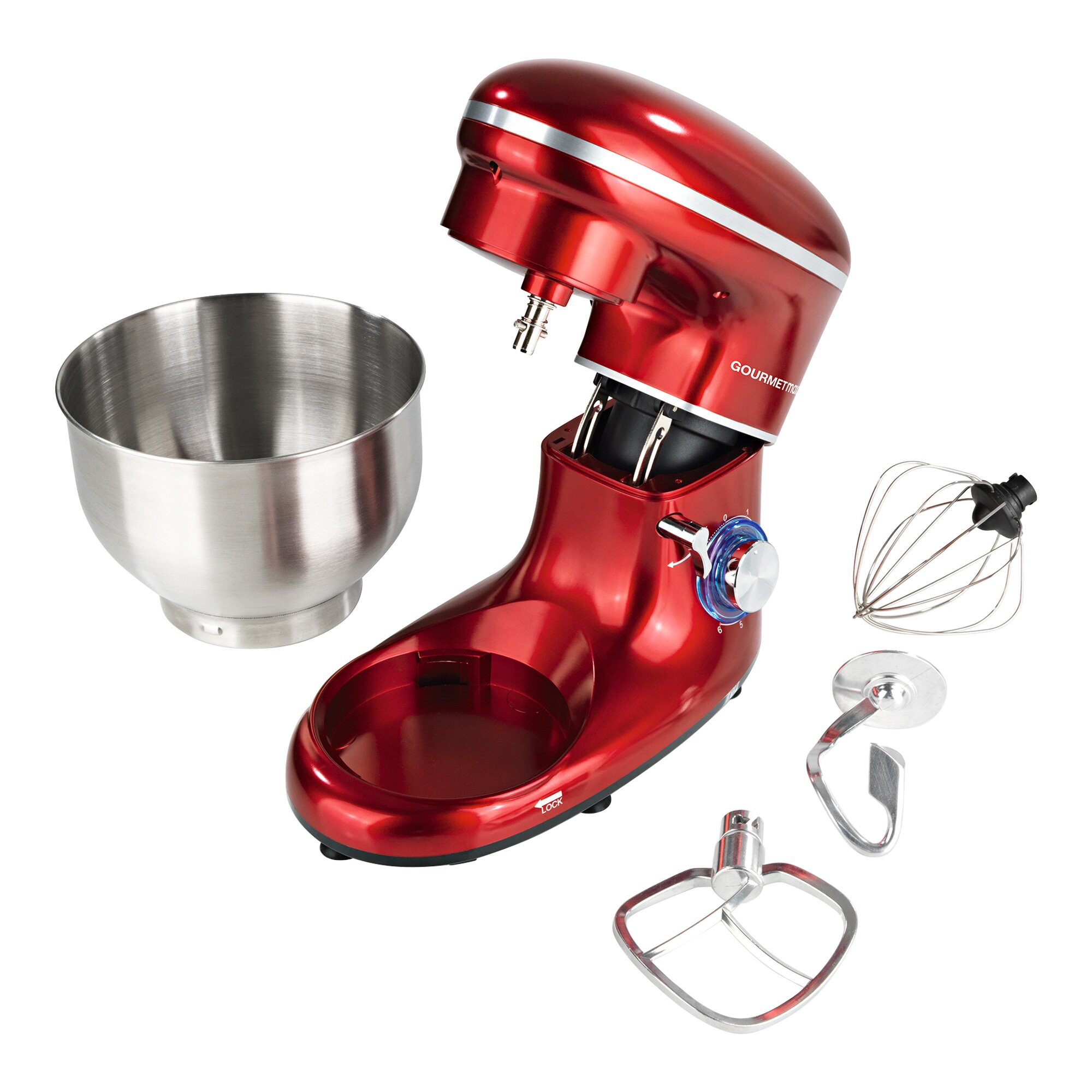 Im Handumdrehen zum Küchenprofi! Diese leistungsstarke Küchenmaschine von GOURMETmaxx macht das Backen und Kochen so einfach wie noch nie. Egal, ob Sie Teig mischen, rühren, kneten oder Sahne aufschlagen wollen: Die Küchenmaschine übernimmt mit ihren 6 Geschwindigkeitsstufen, Turbofunktion und Direktantrieb jede Aufgabe zuverlässig. Dank der kippbaren Motoreinheit können Sie die Einsätze ganz einfach auswechseln – optimaler Bedienkomfort, und dabei auch noch geräuscharm! Optisch vollendet wird die Küchenmaschine durch hochwertige Details aus Edelstahl. Inkl. Rührschüssel und 3 Rühraufsätzen. Mit LED-Ring zur Betriebskontrolle. Sahne schlagen Teig rühren Kipp-Aufsatz edle Optik 6 Geschwindigkeitsstufen Material: Kunststoff, Kupfer Füllmenge: 5 l