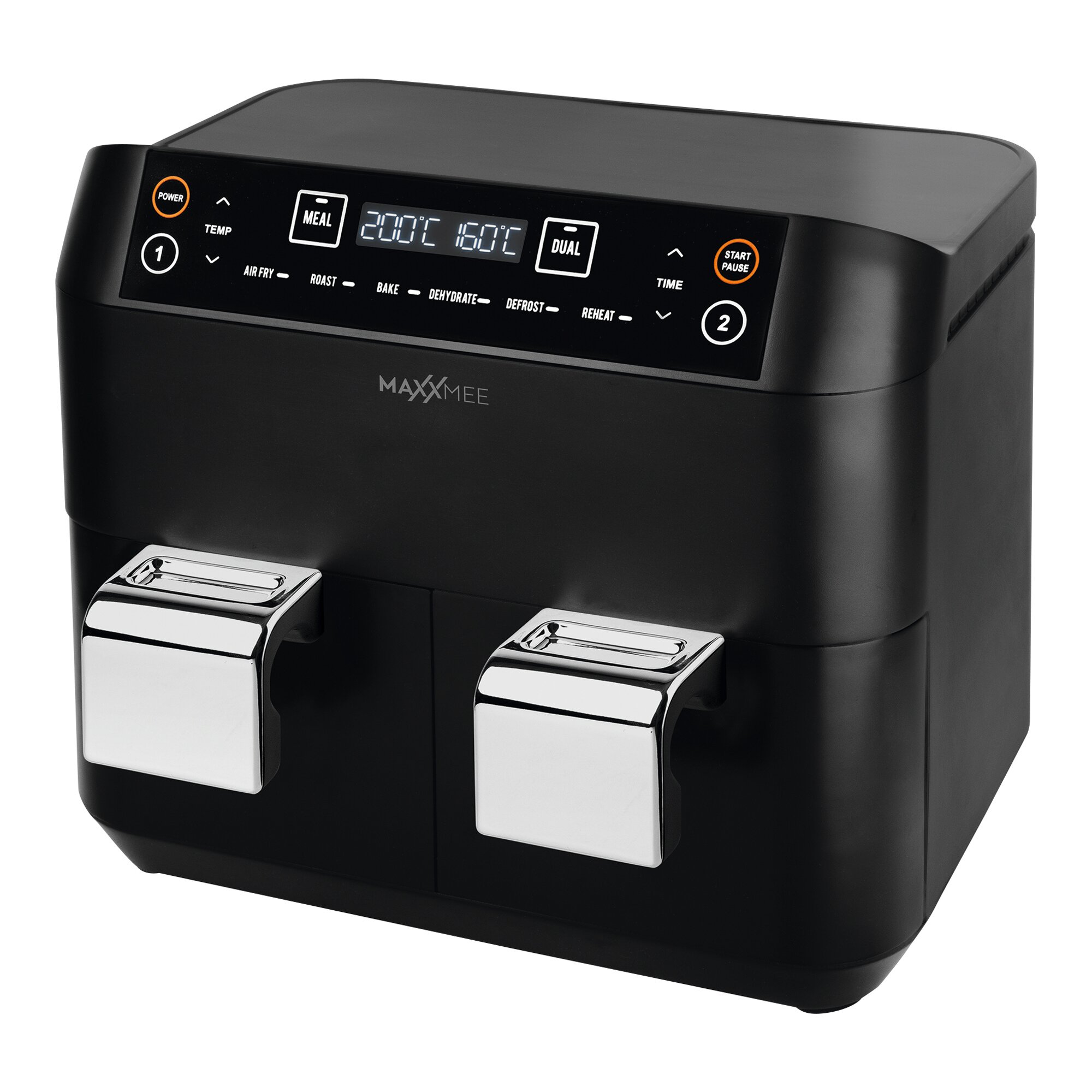Die intelligenteste Heißluft-Fritteuse, die du je gesehen hast: Mit der „MAXXMEE“ Heißluft-Fritteuse mit Doppelkorb frittierst du nicht nur besonders schnell und fettarm dank Heißluft-Zirkulation, sondern bereitest auch im Handumdrehen ganze Menüs für dich und deine Familie zu! Zwei separate Kammern mit synchronisierten Garzonen ermöglichen dir zwei geniale Arten der Zubereitung: Mit der DUAL-Funktion kannst du in beiden Garzonen dieselben Einstellungen verwenden und erhältst damit die doppelte Menge in der gleichen Zeit – z. B. bis zu 8 Portionen knusprige Pommes frites! Mit der MEAL-Funktion kannst du in den separaten Kammern zwei verschiedene Mahlzeiten mit unterschiedlichen Programmen, unterschiedlicher Garzeit und unterschiedlicher Temperatur punktgenau zubereiten, so dass alles zur gleichen Zeit servierfertig ist. Programme, Garzeiten und Temperaturen können in beiden Kammern individuell eingestellt werden, und das Ende der Garzeiten wird synchronisiert. So sind z. B. Pommes frites und Fischfilet auf den Punkt gleichzeitig fertig zubereitet – mit nur einem Gerät. Entdecke köstlich-knusprigen Genuss, so komfortabel und einfach wie nie! Mit 6 voreingestellten Programmen (Frittieren, Auftauen, Schmoren/Rösten, Backen, Aufwärmen von Speisen und Dörren) und manuellem Modus, LED-Display und 240 Minuten-Timer. Körbe und Knusperbleche spülmaschinengeeignet. Technische Daten: 220-240 V, 50/60 Hz, 6 Programme, max. 2400 W, 240-Minuten-Timer-Funktion. Im Lieferumfang enthalten: 1 x Fritteuse, 2 x Korb und 2 x Knusperblech Gesamtfüllmenge: 7,6 l