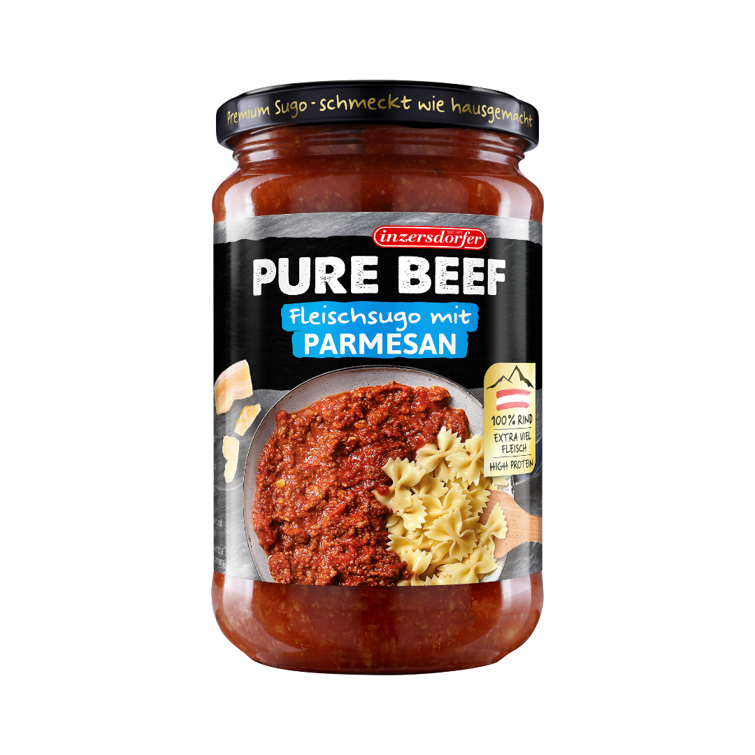 Inzersdorfer Pure Beef Fleischsugo Parmesan Wir freuen uns, Ihnen das Inzersdorfer Pure Beef Fleischsugo Parmesan vorstellen zu dürfen. Diese Tomatensauce mit Rindfleisch und Parmesan ist ein wahrer Genuss für Feinschmecker. Das Tomatenfruchtfleisch bildet mit dem Rindfleisch und dem Parmigiano Reggiano g.U. eine perfekte Basis für ein intensives Geschmackserlebnis. Die Zutaten des Inzersdorfer Pure Beef Fleischsugo Parmesan sind von höchster Qualität. Die Sauce enthält keine künstlichen Zusatzstoffe oder Geschmacksverstärker. Aufgrund der schonenden Verarbeitung bleiben die wertvollen Inhaltsstoffe und der natürliche Geschmack erhalten. Die Zubereitung des Inzersdorfer Pure Beef Fleischsugo Parmesan ist denkbar einfach. Sie können die Sauce in der Mikrowelle (umgefüllt in geeignetes Geschirr) oder im Kochtopf erhitzen und dann direkt servieren. Der Inzersdorfer Pure Beef Fleischsugo Parmesan ist eine perfekte Wahl für alle, die eine schnelle und dennoch qualitativ hochwertige Mahlzeit genießen möchten. Die Sauce eignet sich hervorragend als Basis für Pasta-Gerichte oder als Beilage zu Fleisch und Gemüse. Überzeugen Sie sich selbst von der Qualität und dem Geschmack des Inzersdorfer Pure Beef Fleischsugo Parmesan und bestellen Sie noch heute. Tomatensauce mit Rindfleisch und Parmesan Netto Füllmenge Nettogehalt 400.00 Gramm,Bruttogewicht 0.632 Kilogramm Allergene Enthält – Ist im Produkt enthalten Milch und Milcherzeugnisse Aufbewahrung Mindestens haltbar bis Ende: siehe Glasschulter. Trocken, vor Frost und Hitze geschützt lagern. Nach dem Öffnen gekühlt lagern und innerhalb von 3 Tagen verbrauchen. Zutaten Zutaten: Tomatenfruchtfleisch 42 %, Rindfleisch 24 %, Wasser, Tomatenmark doppelt konzentriert 11 %,Parmigiano Reggiano g.U. 3 % (KÄSE), Zwiebel, Zucker, Speisesalz jodiert (Speisesalz, Kaliumiodid), modifizierte Stärke, Säuerungsmittel: Citronensäure, Kräuter, Gewürze. Rindfleisch aus Österreich. Nährwerte pro 100g Unzubereitet 100 Gramm, Energie 108,00 kcal, Energie 452,00 kJ, Fett 5,90 g, davon gesättigte Fettsäuren 2,80 g, Kohlenhydrate 7,00 g, davon Zucker 5,90 g, Eiweiß 6,40 g, Salz 1,70 g Verwendung Zubereitung unter Benutzung von Mikrowellen In der Mikrowelle: Inhalt in passendes Mikrowellengeschirr leeren und zugedeckt erhitzen.,Erhitzen und servieren – Vor dem Servieren erhitzen oder erwaermen Im Kochtopf: Inhalt in passenden Topf leeren und unter ständigem Rühren erhitzen. Marke INZERSDORFER Hersteller Name: Maresi Austria GmbH,Adresse: Postfach 111, A-1131 Wien,Webseite: www.inzersdorfer.at,Telefon: 0800/216411