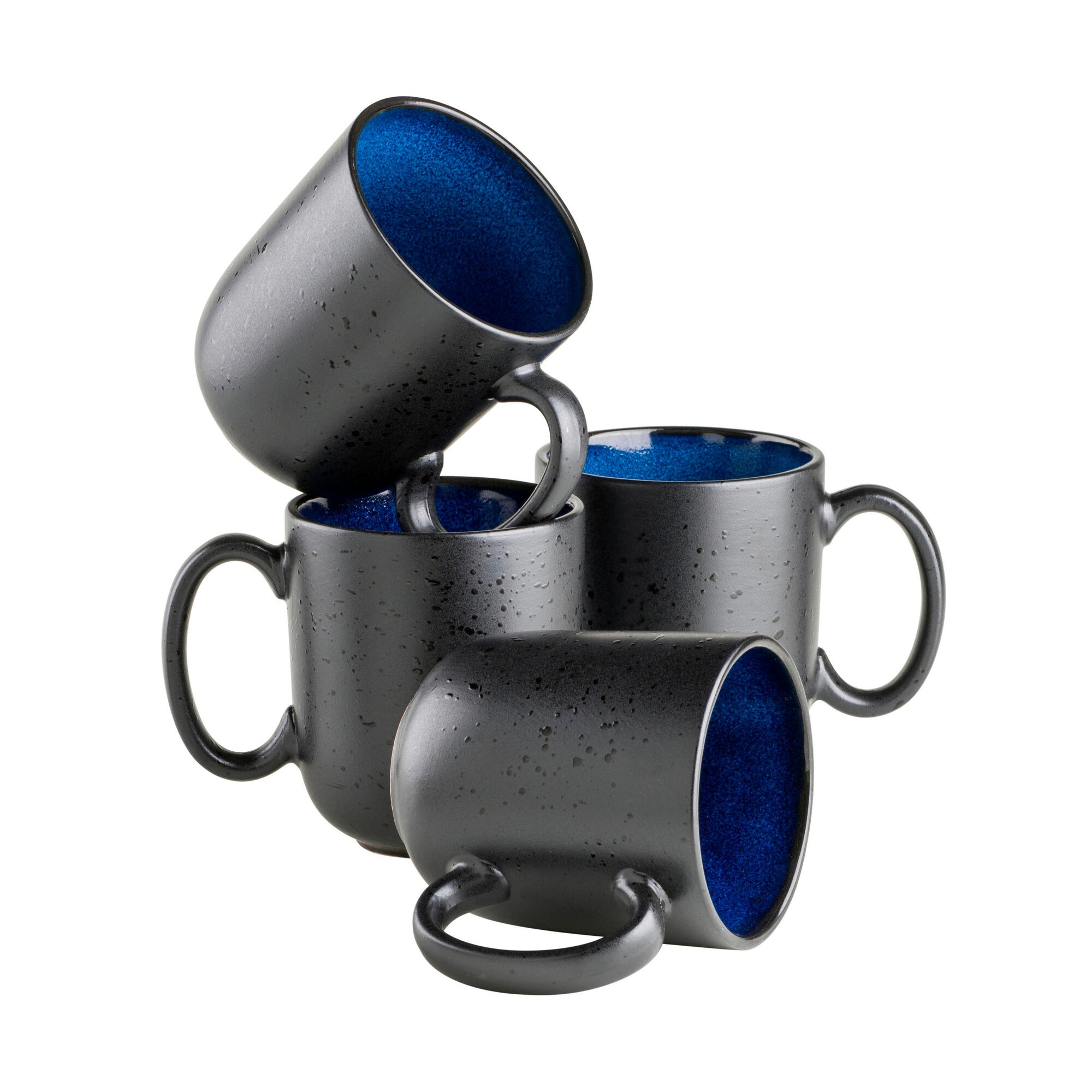 Die unvergleichliche Keramikgeschirr-Serie „Niara“ der österreichischen Traditionsmarke Mäser verbindet auf einzigartige Weise selbstbewusste skandinavische Formen mit zwei unterschiedlichen Glasurtechniken: Auf den Ober- bzw. Innenseiten der Geschirrteile fließen strahlende Farbschattierungen auf schwarzem Untergrund zu wunderbaren Maserungen zusammen. Die Außen- bzw. Unterseiten hingegen bestechen durch eine Mattglasur in Schwarz, welche mit glänzenden schwarzen Sprenkeln überzogen wurde. Durch die händisch aufgetragenen Farben ist jedes Teil in dieser Kollektion auf allen Seiten einzigartig gemustert. Mit ihrem exquisiten und individuellen Charakter ist die Kollektion „Niara“ ein echter Hingucker auf jedem Esstisch. Gefertigt aus langlebigem, hochwertigem Steinzeug (welches nicht mit dem deutlich brüchigeren Steingut zu verwechseln ist) wird Ihnen dieses Geschirrset lange Freude bereiten. Selbstverständlich ist die gesamte Serie „Niara“ mikrowellen- und spülmaschinengeeignet. Dieses Set wird in einer vielfach auf Bruchsicherheit getesteten Paketversandverpackung aus nachhaltigen Materialien versendet. Bitte beachten Sie: Diese Kollektion wird händisch lasiert, wodurch minimale Unebenheiten der Glasur, kleine Einschlüsse und leichte Farbabweichungen auftreten können. Zur besseren objektiven Vergleichbarkeit gehen unsere Füllmengenangaben von einer randvollen Befüllung aus.Dieses Set besteht aus: Kaffeebecher 465 mlAnzahl: 4Größe: 465Material: SteinzeugPersonenanzahl: 4Serie: NiaraVerzierungsfarbe: Farbig ohne Dekor