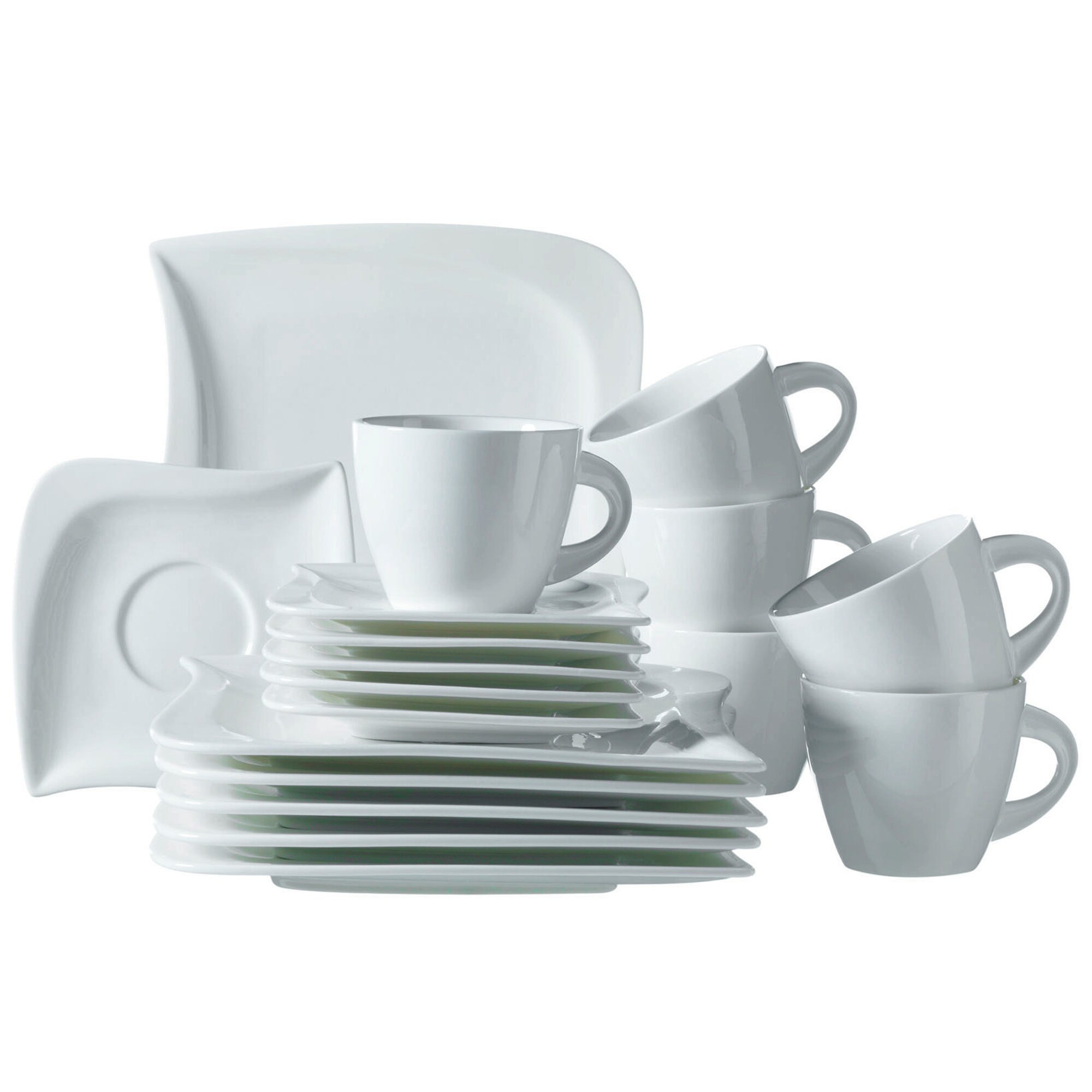 Das zeitlose 18-teilige Kaffeeservice »LA MUSICA« verleiht dem Tisch Stil. Für mehr Anmut und Eleganz steht das stilvolle Geschirr. Es wird aus hochwertigem Durable Porzellan gefertigt und bietet ein optimales Zusammenspiel aus Qualität und Ästhetik. Geschwungene Formen verleihen dem Service einen filigranen und zarten Charakter. Sowohl im Alltag als auch zu besonderen Anlässen ist es eine Bereicherung. Das zeitlose Kaffeeservice »LA MUSICA« punktet mit hohen Qualitätseigenschaften und ist weiterhin spülmaschinen- und mikrowellengeeignet. Dieses Set besteht aus:6 x Kaffeeobertasse à 21,5 cl6 x Kaffeeuntertasse à 13,6 cm6 x Dessertteller à 21,5 cmAnzahl: 18-teiligAnzahl Dessertteller (bp): 6Anzahl Tasse (bp): 6Anzahl Untertasse (bp): 6Durchmesser Dessertteller (bp): 21,5Durchmesser Untertasse (bp): 13Farbe: ElfenbeinMaterial: PorzellanPersonenanzahl: 6Serie: La MusicaTitel (bp): Kaffeeservice „LA MUSICA “ , 18tlg.Typ: KaffeeserviceVerzierungsfarbe: keineVolumen Tasse (bp): 215