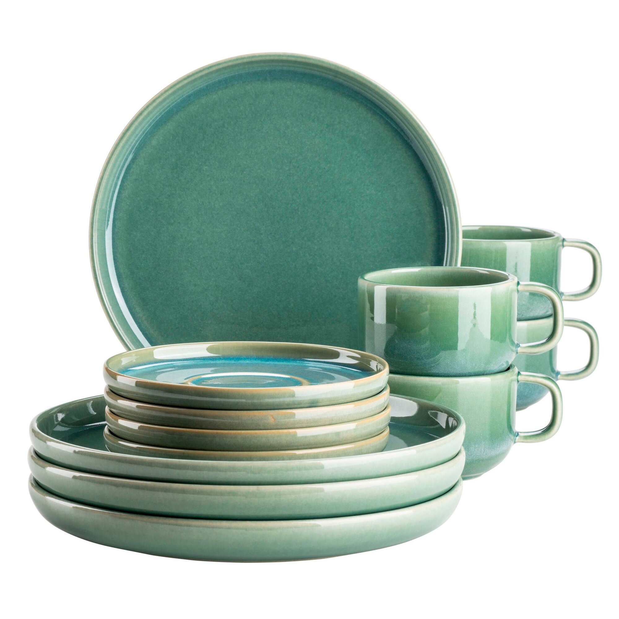 Aufregende Naturfarbtöne in verschiedenen Farbwelten fließen auf der Keramikgeschirr-Kollektion „Elina Uno“ der österreichischen Traditionsmarke MÄSER ineinander und bilden auf jedem Teller, jeder Tasse und jeder Schale ein einzigartiges Muster aus, welches je nach Lichteinfall in unterschiedlichen Nuancen schimmert. Die besondere Glasurtechnik dieser außergewöhnlichen Essgeschirr-Serie macht jedes Teil zu einem echten Unikat. Die beiden Farbwelten Jungle und Beach lassen sich harmonisch miteinander kombinieren und bringen ein unvergleichliches tropisches Feeling auf Ihren Esstisch. Mit ihren großzügig-schlichten skandinavischen Formen bietet die Serie „Elina Uno“ viel Raum für Ihre kulinarischen Kreationen sowie für Dekoration. Die gesamte Kollektion wird in Portugal unter nachhaltigen Bedingungen aus regional gewonnenem Steinzeug gefertigt. Hierbei handelt es sich um eine hochwertige Form der Keramik, welche nicht mit dem brüchigeren und poröseren Steingut zu verwechseln ist. In seiner täglichen Handhabung unterscheidet sich hochwertiges Steinzeuggeschirr kaum von Porzellangeschirr: Die gesamte Serie ist mikrowellen- und spülmaschinengeeignet, hitzebeständig und tiefkühlgeeignet und damit absolut alltagstauglich. Dieses Service Set wird in einer vielfach auf Bruchsicherheit getesteten Paketversandverpackung aus umweltfreundlichen Materialien versendet. Bitte beachten Sie: Durch die besondere Glasurtechnik können minimale Unebenheiten in der Glasur auftreten, ebenso tragen Farbabweichungen zwischen verschiedenen Teilen zum typischen, lebendigen Charakter dieser Kollektion bei. Zur besseren objektiven Vergleichbarkeit gehen unsere Füllmengenangaben stets von einer randvollen Befüllung aus.Dieses Kaffeeservice besteht aus: 4 x Kaffeeobere 22 cl4 x Kaffeeuntere 14,5 cm4 x Dessertteller 22 cmAnzahl: 12Farbe: GrünMaterial: SteinzeugPersonenanzahl: 4Serie: Elina UnoVerzierungsfarbe: Farbig ohne Dekor