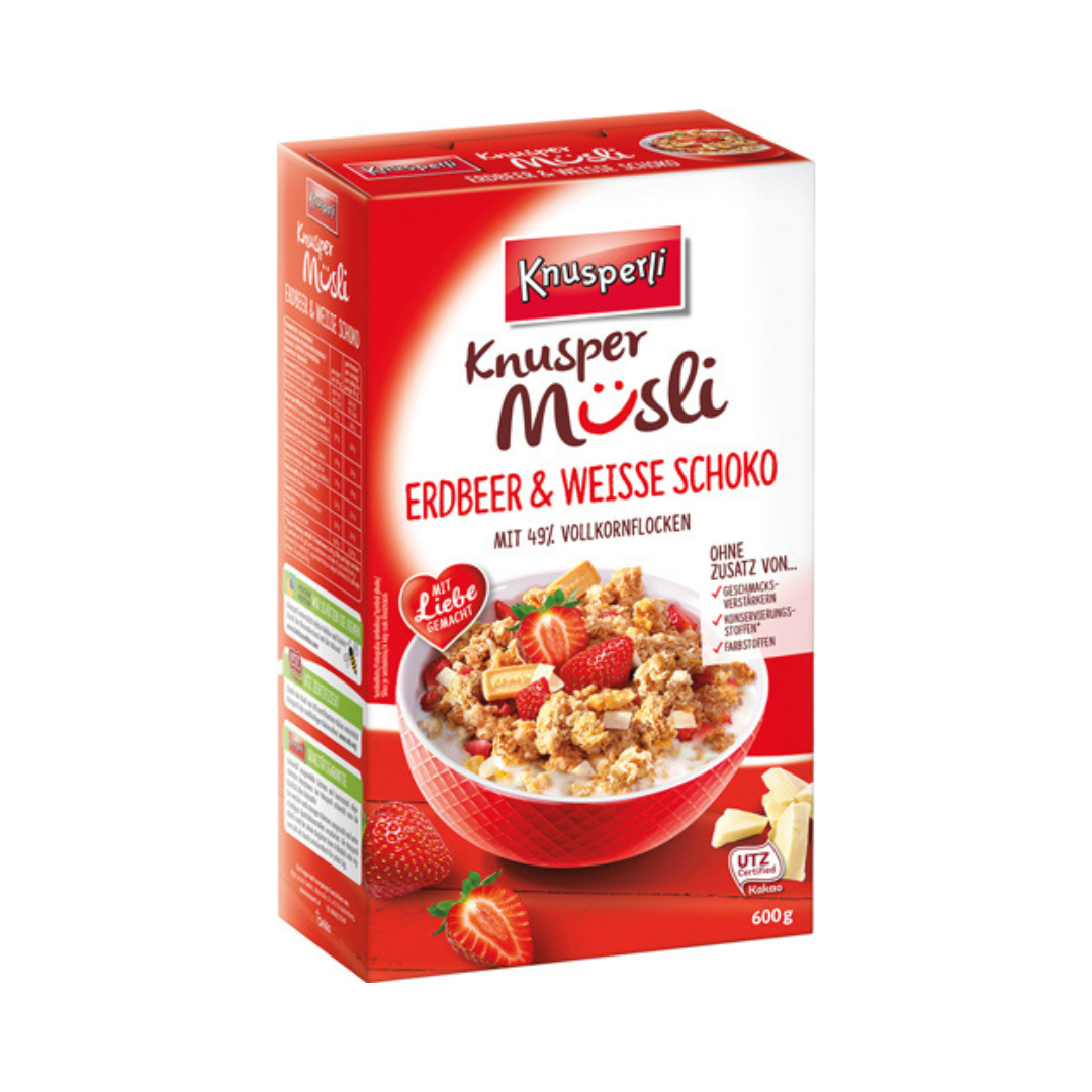 INFO: Dieser Artikel ist von einer Produktumstellung betroffen. Der Nachfolgeartikel folgt demnächst. Wir informieren per Newsletter! Knusperli Knusper Müsli Erdbeer & Weisse Schoko, 600 Gramm Packung Müsli nur zum Frühstück? Das Knusperli Knuspermüsli ist auch als kleiner Snack zwischendurch wunderbar geeignet. Die unwiderstehlichen und wohlschmeckenden Knuspermüslis schenken Vitalität und Elan zu jeder Tageszeit. Knuspermüsli mit gefriergetrockneten Erdbeeren (1,2%), weißen Schokoladestückchen (8%) und Knusperli-Keksen (3%) Netto Füllmenge Nettogehalt 600.00 Gramm,Bruttogewicht 660.00 Gramm Allergene Kann Spuren enthalten von Sojabohnen und -erzeugnisse,Sesamsamen und -erzeugnisse,Erdnüsse und -erzeugnisse,Nüsse und Nusserzeugnisse. Kann Mandeln, Haselnüsse, Walnüsse, Cashewnüsse etc. einschliessen,Enthält – Ist im Produkt enthalten Milch und Milcherzeugnisse,Glutenhaltiges Getreide sowie daraus hergestellte Erzeugnisse Zutaten Zutaten: Vollkorn-HAFERFLOCKEN (49%), Zucker, Palmöl, Reismehl, Mais, VOLLMILCHPULVER, WEIZENMEHL, Kakaobutter, Kokosraspel, gefriergetrocknete Erdbeerstücke, Apfelsaftkonzentrat, Salz, Honig, Palmfett, WEIZENKLEBER, GERSTEN- und WEIZENMALZMEHL, GERSTENMALZEXTRAKT, Aroma, Karamellsirup, Emulgator: Lecithine. Kakaoanteil: 1,7% Kann Spuren von Erdnüssen, Soja, Schalenfrüchten und Sesam enthalten. Nährwerte pro 100g Unzubereitet 1 Portion, Energie 117,00 kcal, Energie 744,00 kJ, Fett 6,00 g, davon gesättigte Fettsäuren 2,80 g, Kohlenhydrate 26,00 g, davon Zucker 10,00 g, Ballaststoffe 2,30 g, Eiweiß 3,60 g, Salz 0,24 g , Unzubereitet 100 Gramm, Energie 1.859,00 kJ, Energie 443,00 kcal, Fett 15,00 g, davon gesättigte Fettsäuren 6,90 g, Kohlenhydrate 65,00 g, davon Zucker 25,00 g, Ballaststoffe 5,80 g, Eiweiß 9,00 g, Salz 0,60 g Hersteller Name: Felix Austria GmbH,Adresse: Felixstraße 24, A-7210 Mattersburg