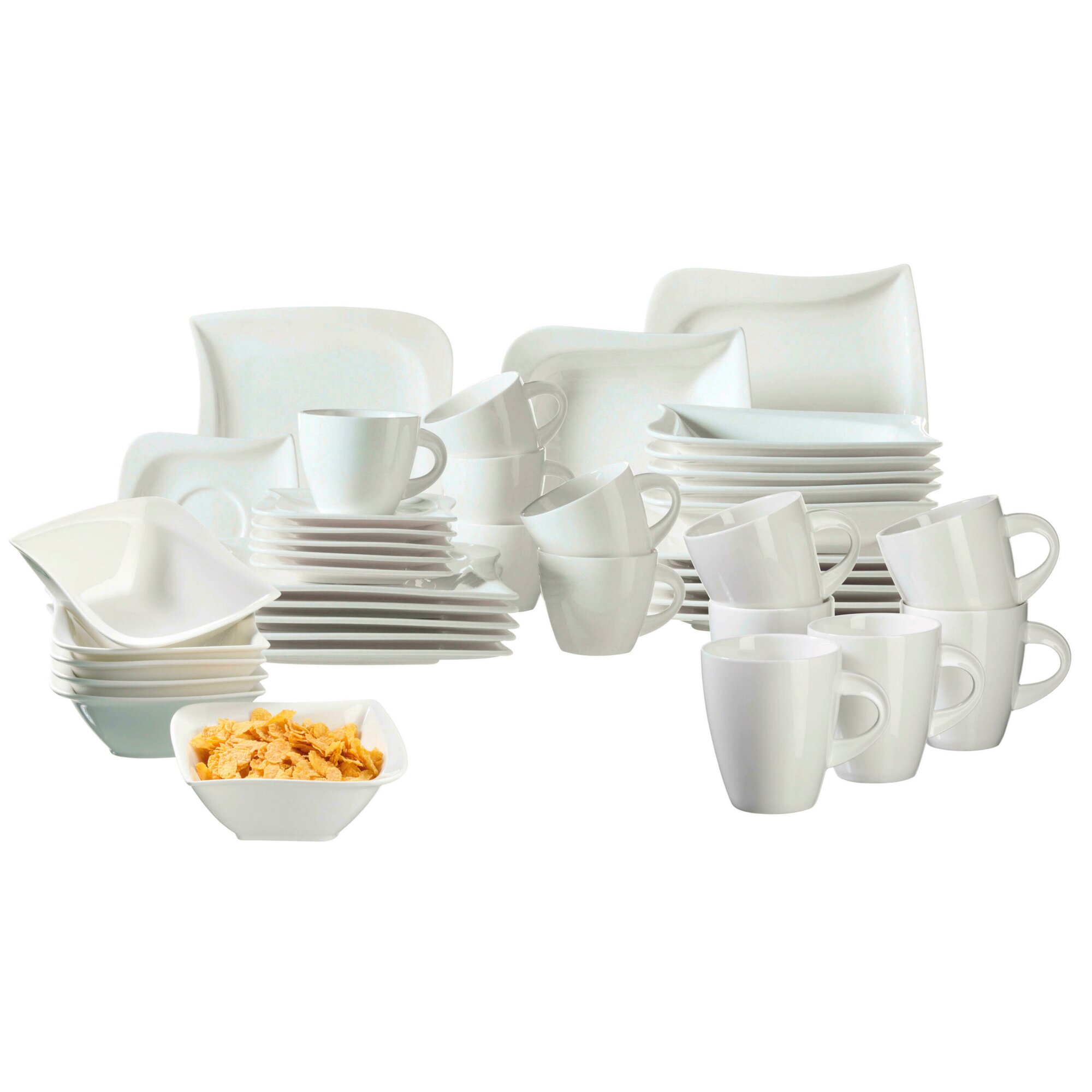 Modern und zeitlos zugleich: Die bewährte Klassikserie LA MUSICA der österreichischen Traditionsmarke MÄSER erfreut sich nicht nur wegen ihrer charakteristisch geschwungenen Formgebung großer Beliebtheit – sondern auch aufgrund des hochwertigen Hotelporzellans, das dieser Serie trotz der feinen Optik eine besondere Robustheit verleiht. Die Serie LA MUSICA verspricht ein perfektes Zusammenspiel von Funktionalität und Extravaganz, das Sie über viele Jahre erfreuen wird. Dieses Kombiservice wird in einer speziell für dieses Set entwickelten, vielfach getesteten Transportverpackung aus umweltschonenden Materialien versendet.Farbe: ElfenbeinAnzahl: 42Anzahl Becher (bp): 6Anzahl Dessertteller (bp): 6Anzahl Müslischale (bp): 6Anzahl Speiseteller (bp): 6Anzahl Suppenteller (bp): 6Anzahl Tasse (bp): 6Anzahl Untertasse (bp): 6Durchmesser Dessertteller (bp): 21,5Durchmesser Müslischale (bp): 14Durchmesser Speiseteller (bp): 25,5Durchmesser Suppenteller (bp): 22Durchmesser Untertasse (bp): 13,6Farbe: ElfenbeinMaterial: PorzellanPersonenanzahl: 6Serie: La MusicaTitel (bp): Kombiservice „LA MUSICA “ , 42tlg.Typ: KombiserviceVerzierungsfarbe: Weiß ohne DekorVolumen Becher (bp): 400Volumen Tasse (bp): 215