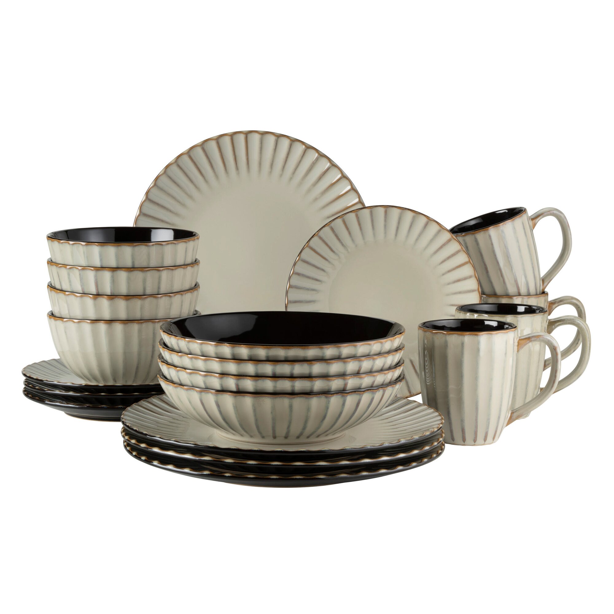 Die aufregende Kombination aus runden Retro-Formen mit Wellenrelief einerseits und einer modernen, unregelmäßigen Glasurtechnik mit schwarzen Akzenten andererseits verleiht der Tafelgeschirr-Kollektion „Confino“ eine ganz besondere Eleganz. Die Keramikgeschirr-Serie der österreichischen Traditionsmarke MÄSER wird aus hochwertigem Steinzeug gefertigt, welches nicht mit dem deutlich brüchigeren Steingut zu verwechseln ist. Die natürlich wirkenden Farbvarianten dieser Kollektion lassen sich harmonisch miteinander kombinieren. Dieses Set wird in einer vielfach auf Bruchsicherheit getesteten Paketversandverpackung aus nachhaltigen Materialien versendet. Bitte beachten Sie: Diese Kollektion wird händisch bunt lasiert, wodurch minimale Unebenheiten der Glasur, kleine Einschlüsse und leichte Farbabweichungen auftreten können. Zur besseren objektiven Vergleichbarkeit gehen unsere Füllmengenangaben von einer randvollen Befüllung aus.Dieses moderne Geschirr-Set besteht aus:4 x Teller flach 27 cm4 x Teller tief 20,5 cm4 x Dessertteller 20 cm4 x Schüssel 15 cm4 x Kaffeebecher 350 mlAnzahl: 20Anzahl Becher (bp): 4Anzahl Dessertteller (bp): 4Anzahl Müslischale (bp): 4Anzahl Speiseteller (bp): 4Anzahl Suppenteller (bp): 4Durchmesser Dessertteller (bp): 20Durchmesser Müslischale (bp): 15Durchmesser Speiseteller (bp): 27Durchmesser Suppenteller (bp): 20,5Material: SteinzeugPersonenanzahl: 4Serie: ConfinoTitel (bp): Kombiservice „CONFINO“ 20tlg.Typ: KombiserviceVerzierungsfarbe: Farbig ohne DekorVolumen Becher (bp): 350