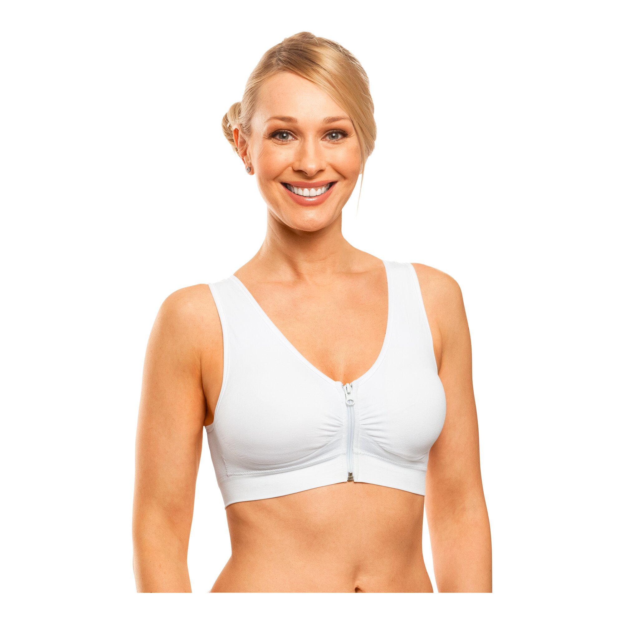 Endlich ein perfekt sitzender BH, der weder zwickt noch kneift, sondern sich angenehm an den Körper anschmiegt und die Brust dabei gut stützt. Der Komfort-BH besitzt ein breites Unterbrustband, das nicht nur ein Einschneiden in die Haut verhindert, sondern der Brust den optimalen Halt bietet. Für zusätzlichen Halt und maximalen Tragekomfort sorgen die extra breiten Träger. Sie entlasten spürbar die Schultern und den Rücken, was vor allem bei einer großen Oberweite eine echte Erleichterung darstellt und Nacken- und Rückenschmerzen vorbeugen kann. Darüber hinaus sorgt das elastische Material für eine besonders gute Stützfunktion und verleiht der Brust dank Push-Up-Effekt eine wunderbare Form. Wer lieber keinen Push-Up-Effekt möchte, kann die Einlagen ganz einfach herausnehmen.Dank seiner Elastizität ist der BH sowohl für kleine wie größere Brüste geeignet. Er ist flexibel in der Größenanpassung und deshalb in zwei Größen erhältlich: Größe S/M entspricht den Kleidergrößen 36 bis 42. Für Damen mit größerer Oberweite bietet sich die Größe L/XL an, sie entspricht den Kleidergrößen 44 bis 50.Vorbei sind die Zeiten, in denen Sie sich verrenken müssen, um den BH schnell zu öffnen oder sicher zu verschließen. Der Komfort-BH besitzt nämlich statt der üblichen Häkchen auf der Rückseite einen Reißverschluss auf der Vorderseite. Dieser ist so in den BH eingearbeitet, dass er leicht erreichbar ist, sich aber nicht unter dem Oberteil abzeichnet. Leichter lässt sich ein BH nicht öffnen oder verschließen!Und das Beste: Der Komfort-BH kommt nicht alleine, sondern im praktischen 2er-Set. Darin enthalten ist einmal der BH in Weiß und einmal in Schwarz – damit Sie immer einen dieser tollen BHs in Reserve haben, falls der andere gerade in der Wäsche ist. So sind Sie für alle Eventualitäten und Outfits bestens gerüstet.Apropos Wäsche: Sie können die BHs schnell per Hand waschen, achten Sie dabei darauf, nicht zu heißes Wasser zu verwenden. Selbstverständlich lassen sich die BHs aber auch problemlos in der Waschmaschine waschen. Nutzen Sie hierfür den Schonwaschgang mit 30 °C. Anschließend lassen Sie die BHs einfach auf der Wäscheleine oder ausgebreitet auf einem Handtuch trocknen. Geben Sie sie bitte nicht in den Wäschetrockner, denn die Hitze könnte das Material beschädigen, sodass die Elastizität verloren geht.