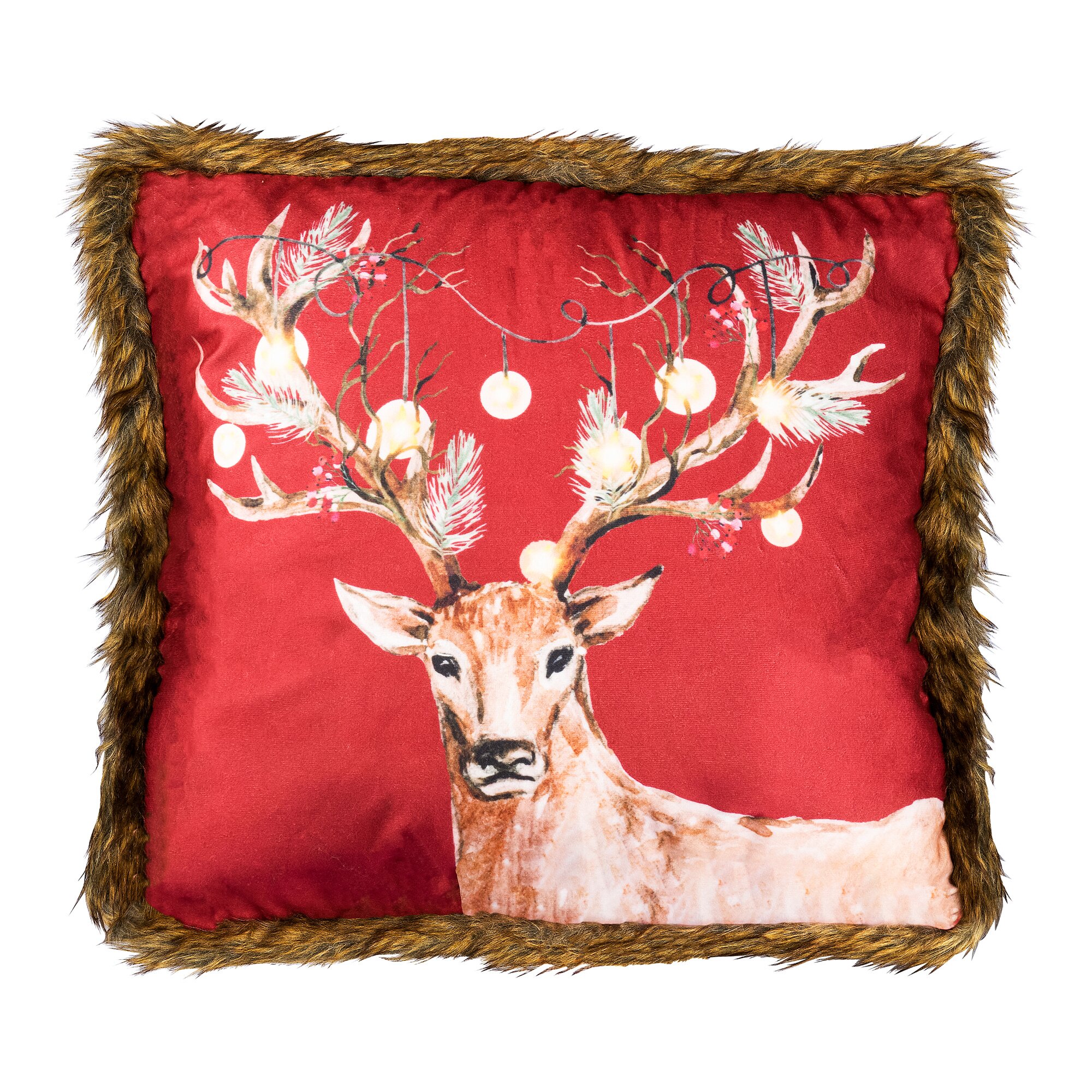 Kuscheln Sie sich an die seidig-glänzende Kissenhülle und genießen Sie entspannte Stunden in der Vorweihnachtszeit. Umrahmt von einem weichen Kunstfellrand, zeigt sich auf der Vorderseite ein stattlicher Hirsch, die Rückseite ist unifarben rot.
