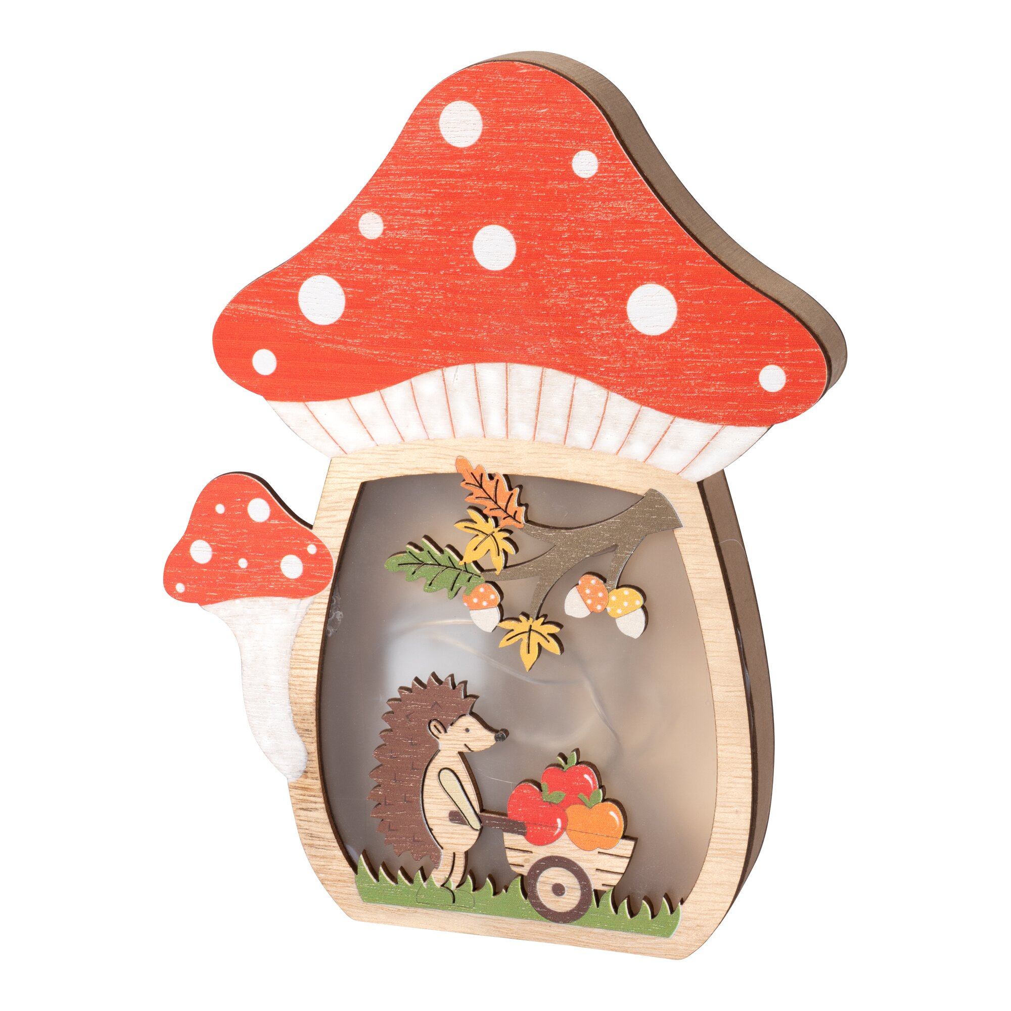 Der fleißige Igel und die eifrigen Eichhörnchen wissen: „Nun ist es an der Zeit, sich einen guten Vorrat an köstlichen Herbstfrüchten anzulegen.“ Die dekorativen Pilze erstrahlen dabei zur Unterstützung im warmen LED-Licht.