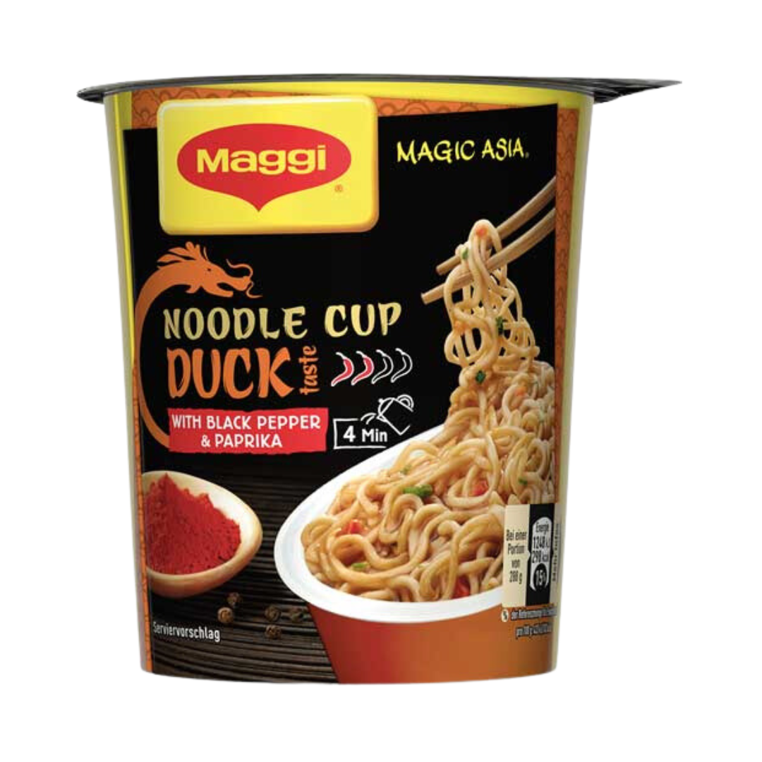 Maggi Magic Asia Noodle Cup Duck, Instant Nudel Snack, 1 Portion, 63 Gramm Netto Füllmenge Bruttogewicht: 79 Gramm Nettogehalt: 63 Gramm Allergene Ist im Produkt enthalten: Sojabohnen und erzeugnisse, Glutenhaltiges Getreide sowie daraus hergestellte Erzeugnisse Kann Spuren enthalten von: Sellerie und erzeugnisse, Senf und erzeugnisse, Eier und erzeugnisse, Milch und Milcherzeugnisse, Sesamsamen und erzeugnisse Aufbewahrung Trocken lagern und vor Wärme schützen. Mindestens haltbar bis Ende: siehe Aufdruck! Zutaten 87,3% frittierte Nudeln [WEIZENMEHL, Sonnenblumenöl, WEIZENGLUTEN, Salz, Säureregulator Kaliumcarbonat, Stabilisator Polyphosphate], Salz, Karotten, Zwiebeln, Lauch, Gewürze (Knoblauch, Chili, Pfeffer, Paprika, Koriander, Ingwer), Kräuter (Petersilie, Schnittlauch), natürliche Aromen, Entenaroma, Hefeextrakt, Karamellzuckersirup, Aromen (mit WEIZEN, SOJA), Sonnenblumenöl, Zucker, Maltodextrin. Kann SELLERIE, EIER, MILCH, SENF und SESAM enthalten. Nährwerte pro 100g Energie Ungefährer Wert (~) 435 Kilojoule Energie Ungefährer Wert (~) 104 Kilokalorie Fett Ungefährer Wert (~) 5 Gramm davon gesättigte Fettsäuren Ungefährer Wert (~) 0,4 Gramm Kohlenhydrate Ungefährer Wert (~) 12,1 Gramm davon Zucker Ungefährer Wert (~) 0,8 Gramm Ballaststoffe Ungefährer Wert (~) 0,7 Gramm Eiweiß Ungefährer Wert (~) 2,2 Gramm Salz Ungefährer Wert (~) 1,1 Gramm Ursprungsland UKRAINE Verwendung SO WIRD'S GEMACHT: 1. Deckel entfernen. GemüseKräuter Mix + Würzung hinzugeben. 2. Kochendes Wasser bis zur Fülllinie aufgießen. 3. 4 Min. ziehen lassen. Dabei gelegentlich umrühren. Fertig. Tipp: Würzung nach Geschmack dosieren. Marke MAGGI Hersteller Name: Nestlé Österreich GmbH,Adresse: Wiedner Gürtel 9, A-1100 Wien