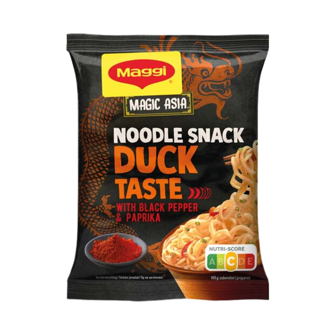 Maggi Magic Asia Nudel Snack Ente, 1 Portion, 62 Gramm Unkompliziert, schnell und gut: Mit dem MAGGI Magic Asia Noodle Snack Duck holt man sich nicht nur ein würziges Geschmackserlebnis nach Hause, sondern auch mehr Abwechslung in die Küche. Der intensive asiatische Geschmack mit gebratener Ente und leckeren Gemüsestückchen ist typisch für chinesische Nudeln, also Stäbchen raus und los! Maggi Magic Asia Instant Nudel Snack Ente: * Ergibt eine leckere Portion. * Asiatische Nudeln mit feinem Entengeschmack und aromatischer Würzmischung. * Als köstlicher Snack oder als kleine Mahlzeit im Büro, zuhause oder unterwegs. * Schnell und unkompliziert zubereitet. Nudelsnack, asiatisch gewürzt, mit 16% Sonnenblumenöl Netto Füllmenge Bruttogewicht 64.17 Gramm,Nettogehalt 62.00 Gramm Allergene Kann Spuren enthalten von Sellerie und -erzeugnisse,Sesamsamen und -erzeugnisse,Milch und Milcherzeugnisse,Eier und -erzeugnisse,Senf und -erzeugnisse,Enthält – Ist im Produkt enthalten Sojabohnen und -erzeugnisse,Glutenhaltiges Getreide sowie daraus hergestellte Erzeugnisse Aufbewahrung Trocken lagern und vor Wärme schützen. Zutaten 88,7% Nudeln [WEIZENMEHL, Sonnenblumenöl, Salz, Säureregulator (Kaliumcarbonat, Natriumcarbonat), Stabilisator Polyphosphate, Verdickungsmittel Guarkernmehl, Farbstoff Riboflavine], Salz, Aromen, Gewürze (Knoblauch, Zwiebeln, Chili, schwarzer Pfeffer, Paprika, Koriander, Ingwer), Karotten, Lauch, Zucker, Hefeextrakt, karamellisierter Zucker, Palmfett. Kann SELLERIE, EIER, MILCH, SENF, SESAM, SOJA und NÜSSE enthalten. Nährwerte pro 100g Energie Ungefährer Wert (~) 1877 Kilojoule Energie Ungefährer Wert (~) 447 Kilokalorie Fett Ungefährer Wert (~) 18 Gramm davon gesättigte Fettsäuren Ungefährer Wert (~) 2,6 Gramm Kohlenhydrate Ungefährer Wert (~) 59,1 Gramm davon Zucker Ungefährer Wert (~) 1,9 Gramm Ballaststoffe Ungefährer Wert (~) 4,1 Gramm Eiweiß Ungefährer Wert (~) 10,1 Gramm Salz Ungefährer Wert (~) 5,6 Gramm Ursprungsland TÜRKEI Verwendung So wird´s gemacht: 1. Nudeln mit der Würzmischung in eine kleine Schüssel geben. 2. 300ml kochendes Wasser zugießen und alles ca. 4 Min. ziehen lassen. Gelegentlich umrühren. Marke MAGGI Hersteller Name: Nestlé Österreich GmbH,Adresse: Wiedner Gürtel 9, A-1100 Wien