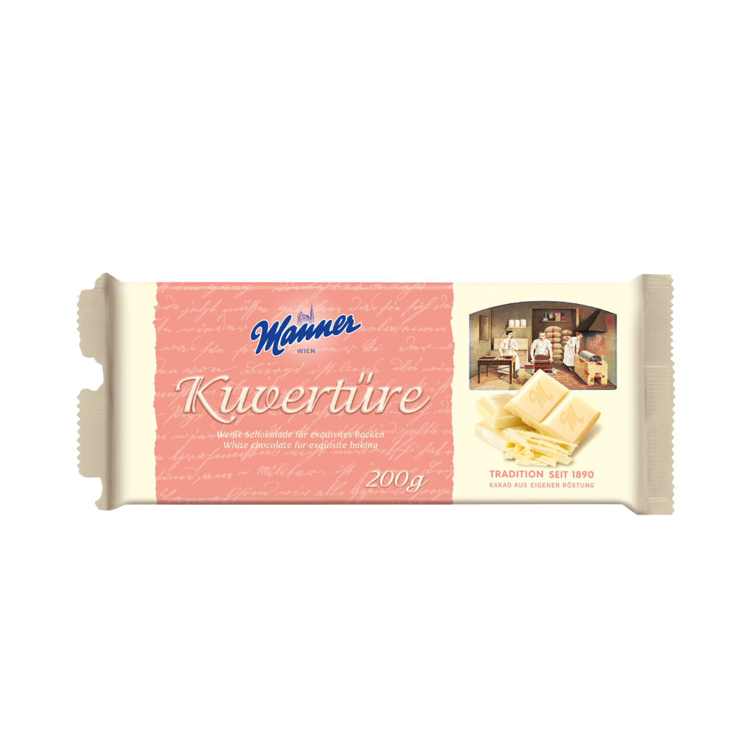 Manner Kuvertüre Weiss, 200 Gramm Tafel Überzugsmasse aus weißer Schokolade Netto Füllmenge Bruttogewicht 0.2033 Kilogramm,Nettogehalt 200.00 Gramm Allergene Enthält – Ist im Produkt enthalten Sojabohnen und -erzeugnisse,Milch und Milcherzeugnisse Aufbewahrung Bei Zimmertemperatur und trocken lagern. Zutaten Zutaten: Zucker, Kakaobutter, VOLLMILCHPULVER, SÜSSMOLKENPULVER, Emulgator: Lecithine (SOJA), natürliches Aroma. Nährwerte pro 100g Unzubereitet 100 Gramm, Energie 2.344,00 kJ, Energie 562,00 kcal, Fett 34,00 g, davon gesättigte Fettsäuren 20,00 g, Kohlenhydrate 59,00 g, davon Zucker 59,00 g, Eiweiß 4,90 g, Salz 0,28 g Verwendung Sieden – Zubereitung der Speise in kochendem Wasser Tipp aus der Backstube: Glasurmasse: 200g Manner Kuvertüre unter ständigem Rühren in heißem, nicht kochendem Wasserbad aufschmelzen. 60g flüssige, warme Butter hinzufügen und verrühren. Kuvertüre/Glasurmasse sollte nicht mehr als ca. 60°C Temperatur erreichen. Spannende Rezepte zum Nachmachen finden Sie unter www.manner.com Marke MANNER Hersteller Name: Josef Manner & Comp. AG,Adresse: Wilhelminenstraße 6, 1170 Wien, Austria,Webseite: www.manner.com
