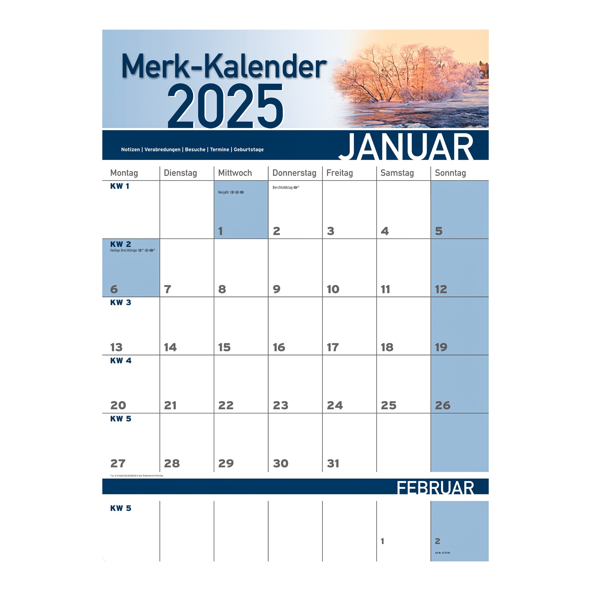 Damit Sie auch im Jahr 2025 keinen Termin oder Geburtstag vergessen, kommt dieser Merkkalender gerade richtig! Die Natur-Motive machen den Kalender zu einem echten Hingucker. Mit Feiertagen und Kalenderwochen. 12 Seiten aus Qualitätspapier.