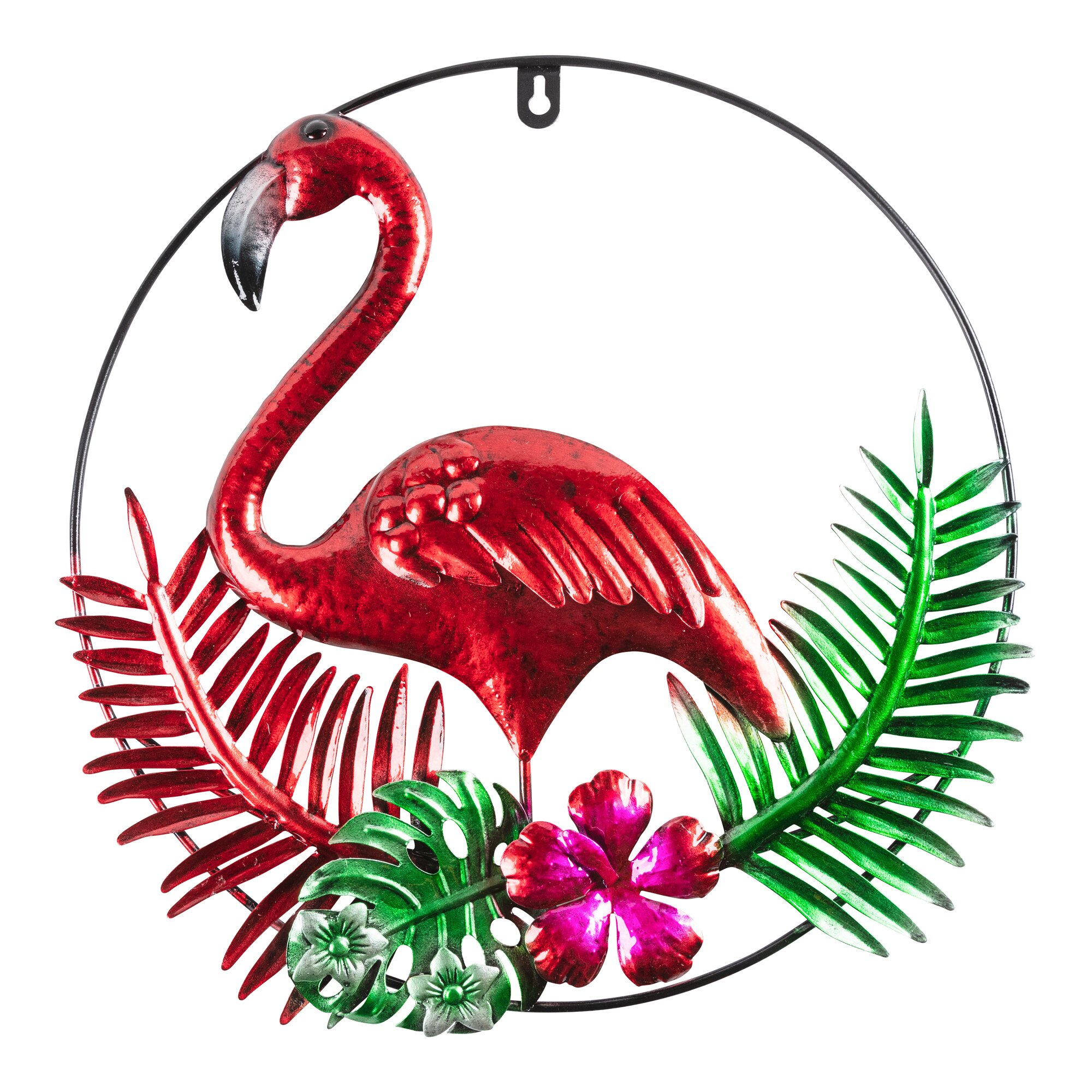 Der filigrane Flamingo im tropischen Blätterwald schafft es mühelos und auf nur einem Bein stehend, Ihrem Garten oder Heim einen Hauch Exotik zu verleihen. Schnell ist er auf Wänden oder Türen gelandet und erfreut täglich Ihr Herz.