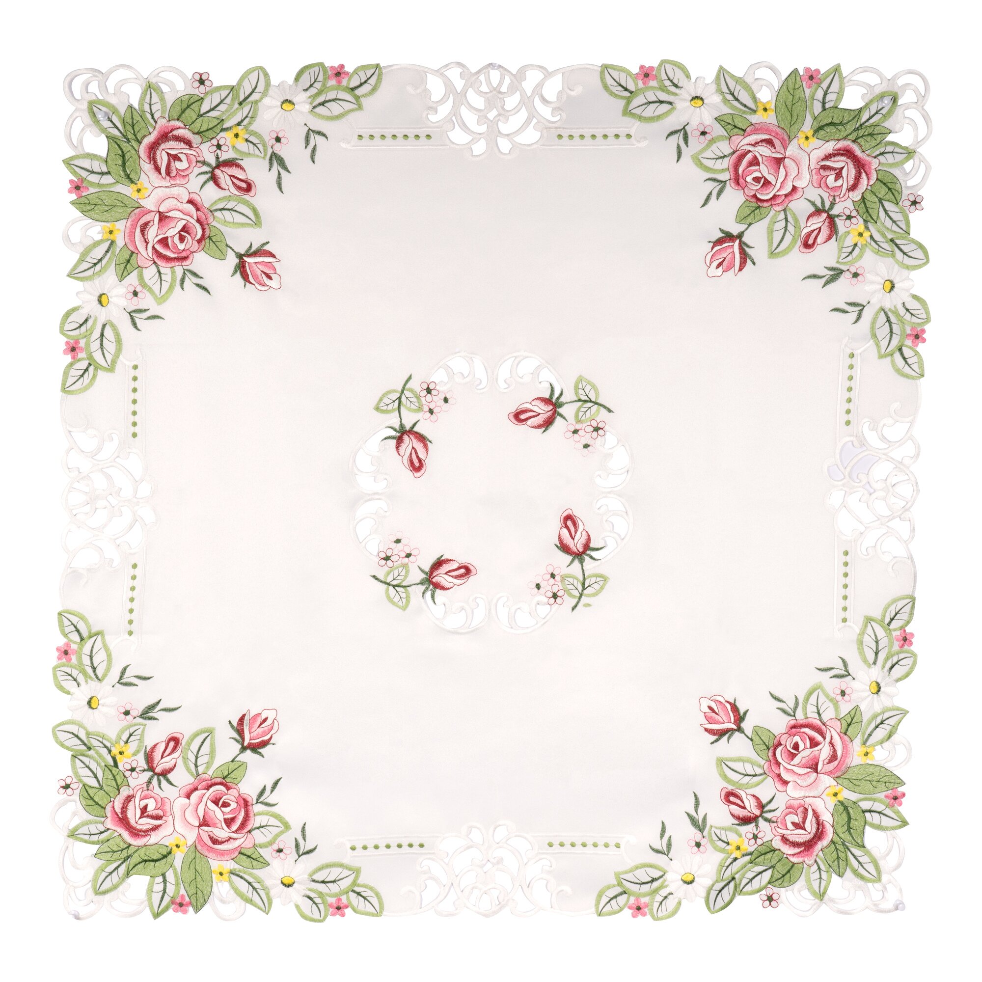Verleihen Sie Ihrem Tisch mit dieser aparten Mitteldecke eine elegante Note. Verziert mit zarter Spitze und romantischer Rosen-Stickerei, ist sie das perfekte Accessoire für eine stilvolle Tischdekoration.