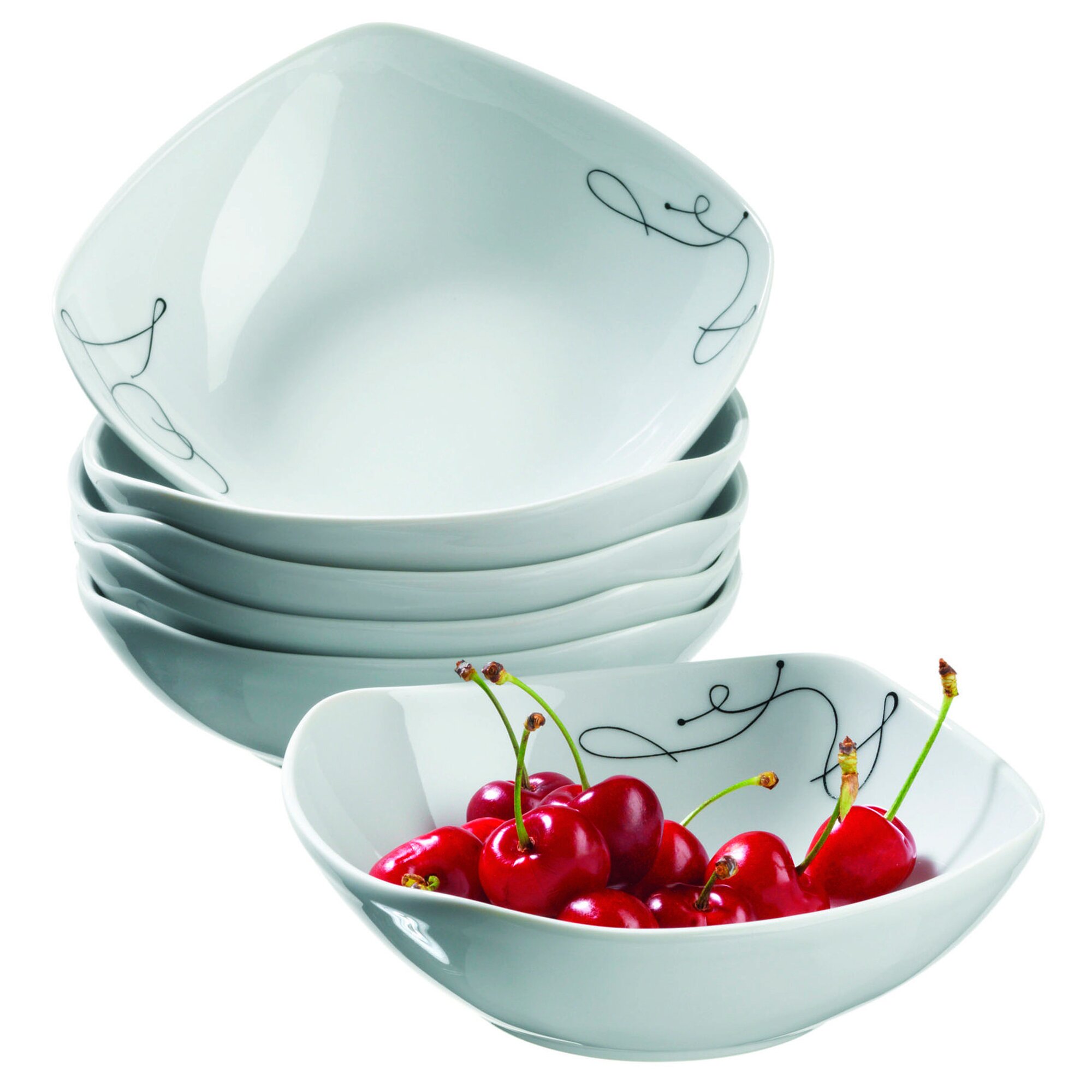 Das 6-teilige Müslischalenset »Chanson« von MÄSER bereichert das Tischambiente mit seiner außergewöhnlichen Formgebung und einem zeitlos schönen Dekor. Sehr modern und dennoch unaufdringlich elegant macht es aus jedem Esstisch eine stilvoll gedeckte Tafel und lässt sich mit unterschiedlicher Tischwäsche und entsprechenden Dekorationen immer wieder neu inszenieren. Jedes Teil ist aus schönem und dennoch robustem Porzellan gefertigt und unkompliziert sowohl spülmaschinen- als auch mikrowellengeeignet. Dank solider Qualität, sorgfältiger Verarbeitung und edler Optik ist das zeitlose Kombiservice »Chanson« eine repräsentative Wahl und für den täglichen Gebrauch ebenso geeignet wie für den festlichen Anlass.Dieses Set besteht aus:6 x Müslischale à 15 cm Die perfekte Ergänzung zu Ihrem Service der Serie ChansonAnzahl: 6er-SetAusführung: MüslischalenFarbe: WeißGröße: 15 cmMaterial: PorzellanPersonenanzahl: 6Serie: ChansonVerzierungsfarbe: Schwarz
