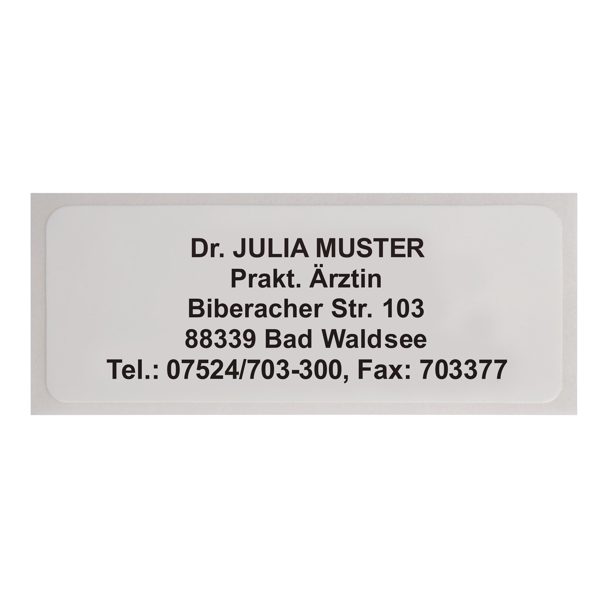 Mit diesen Namensaufklebern bleiben keine Fragen nach dem Eigentümer mehr offen. Das klare Schriftbild von Schrifttyp A eignet sich sowohl für private als auch berufliche Zwecke. Ob in Büchern, auf CDs oder Briefen – die selbstklebenden Namensetiketten lassen sich leicht aus der Spenderbox entnehmen, sind schnell angebracht und sorgen für klare Verhältnisse. Auch für Geschenke oder Leihgaben bieten sich die sauber gedruckten Namensaufkleber an. Bei diesen Namensaufklebern haben Sie die Möglichkeit, fünf Zeilen mit bis zu 30 Zeichen pro Zeile drucken zu lassen. Geben Sie hierzu bei der Bestellung einfach Ihren persönlichen Text in die entsprechenden Felder ein. Es stehen zwei Packungsgrößen zur Auswahl: 300 Stück und 1.000 Stück. Außerdem können Sie zwischen verschiedenen Farben (rot, blau, schwarz, silber, gold) wählen.