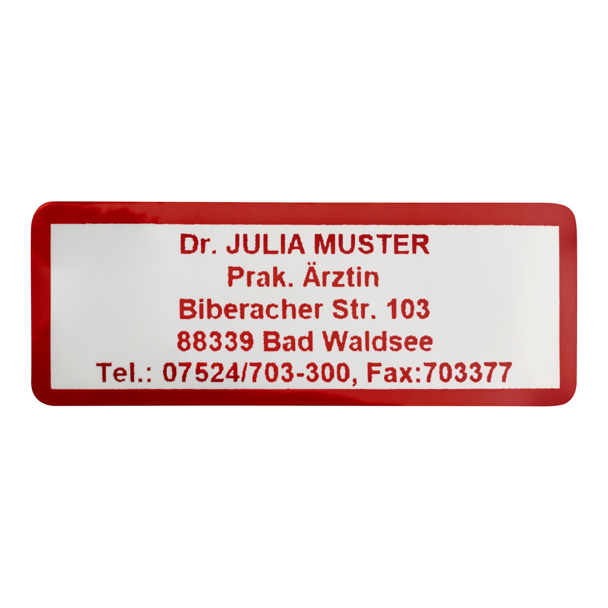 Mit diesen Namensaufklebern bleiben keine Fragen nach dem Eigentümer mehr offen. Das klare Schriftbild von Schrifttyp A eignet sich sowohl für private als auch berufliche Zwecke. Ob in Büchern, auf CDs oder Briefen – die selbstklebenden Namensetiketten lassen sich leicht aus der Spenderbox entnehmen, sind schnell angebracht und sorgen für klare Verhältnisse. Auch für Geschenke oder Leihgaben bieten sich die sauber gedruckten Namensaufkleber an. Bei diesen Namensaufklebern haben Sie die Möglichkeit, fünf Zeilen mit bis zu 30 Zeichen pro Zeile drucken zu lassen. Geben Sie hierzu bei der Bestellung einfach Ihren persönlichen Text in die entsprechenden Felder ein. Es stehen zwei Packungsgrößen zur Auswahl: 300 Stück und 1.000 Stück. Außerdem können Sie zwischen verschiedenen Farben (rot, blau, schwarz, silber, gold) wählen.