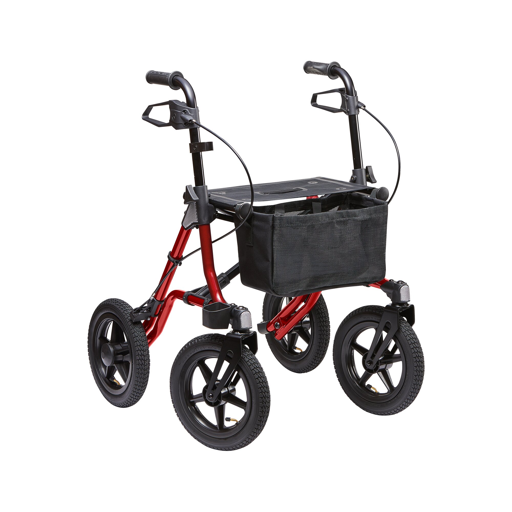 Wenn Sie am liebsten in der Natur unterwegs sind und sich dabei auch nicht von Feld- und Waldwegen aufhalten lassen möchte, ist der Outdoor-Rollator Taima XC von Dietz genau der richtige Begleiter für Sie. Mit seinen 12 Zoll (etwa 30 Zentimeter) großen und für maximalen Fahrkomfort luftbereiften Rädern fährt der wendige Roller problemlos über verschiedene Untergründe. Unebenheiten wie Pfützen, Steine oder Stöcke nimmt der Outdoor-Rollator mit Bravour und dämpft sie gelenkschonend ab. Kanten an Bordsteinen oder Treppen überwinden Sie einfach mit der Ankipphilfe. So sind Sie sowohl auf Kopfsteinpflaster als auch auf unebenen Wegen sicher und komfortabel unterwegs. Sogar Spaziergänge am Strand und Wanderungen sind mit dem Rollator kein Problem.Für sicheren Halt ist der Outdoor-Rollator Taima XC von Dietz mit ergonomisch geformten Griffen ausgestattet. Deren Höhe können Sie zwischen 85 und 95 Zentimetern frei einstellen und so an Ihre individuellen Bedürfnisse anpassen. Direkt darunter befinden sich die großen und leicht erreichbaren Griffe für die Handbremse. Möchten Sie unterwegs eine kurze Verschnaufpause einlegen oder einfach den Blick in die Natur genießen, können Sie auf dem 45 Zentimeter breiten, 23 Zentimeter tiefen und 61 Zentimeter hohen Sitz Platz nehmen. Die Feststellbremse sorgt dafür, dass der mit 9,1 Kilogramm besonders leichte Rollator sicher an Ort und Stelle stehen bleibt.Aufgrund seines geringen Gewichts und der Möglichkeit, ihn mit wenigen Handgriffen platzsparend zusammenzufalten, eignet sich der Outdoor-Rollator auch als Reisebegleiter. Verstauen Sie den Roller im Kofferraum Ihres Autos oder nehmen Sie ihn mit auf Ihre Reise in den Süden oder in die Berge und genießen Sie dort praktisch grenzenlose Mobilität.Ideal für kleine Besorgungen ist die im Lieferumfang enthaltene Netztasche. Sie lässt sich auch nutzen, um beispielsweise die Handtasche, einen Schirm oder Verpflegung für längere Touren zu verstauen. Der am Rollator angebrachte Gehstockhalter ermöglicht Ihnen darüber hinaus, einen Stock mitzunehmen. So können Sie den Roller zum Beispiel vor dem Geschäft oder zu Hause im Hausflur parken und den Rest des Weges zu Fuß gehen. Mit einer maximalen Belastbarkeit von 150 Kilogramm eignet sich der Rollator auch für schwere Personen. Gut zu wissen: Sollte es wider Erwarten zu einer Reifenpanne kommen, lassen sich die hochwertigen Lufträder schnell und kostengünstig austauschen.