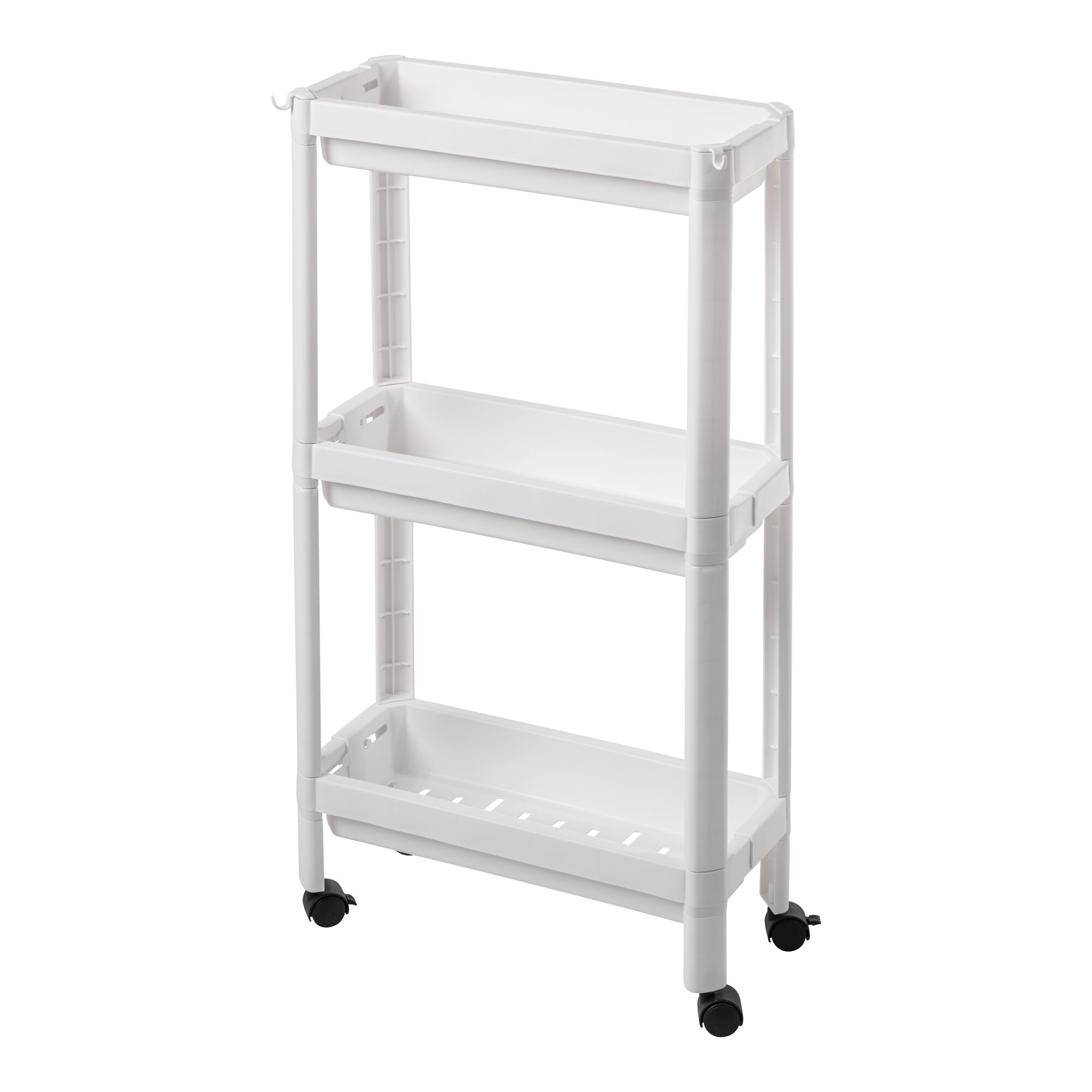 Dank der verstellbaren Breite passt der Rollwagen in verschiedene Nischen und bietet Ihnen auf seinen 3 Etagen viel Platz: Die erhöhten Kanten sorgen für einen sicheren Stand von Putzmittel, Spülutensilien u.v.m. Mit 2 Haken für Bürsten & Co. und Rollen für ein einfaches Verschieben.