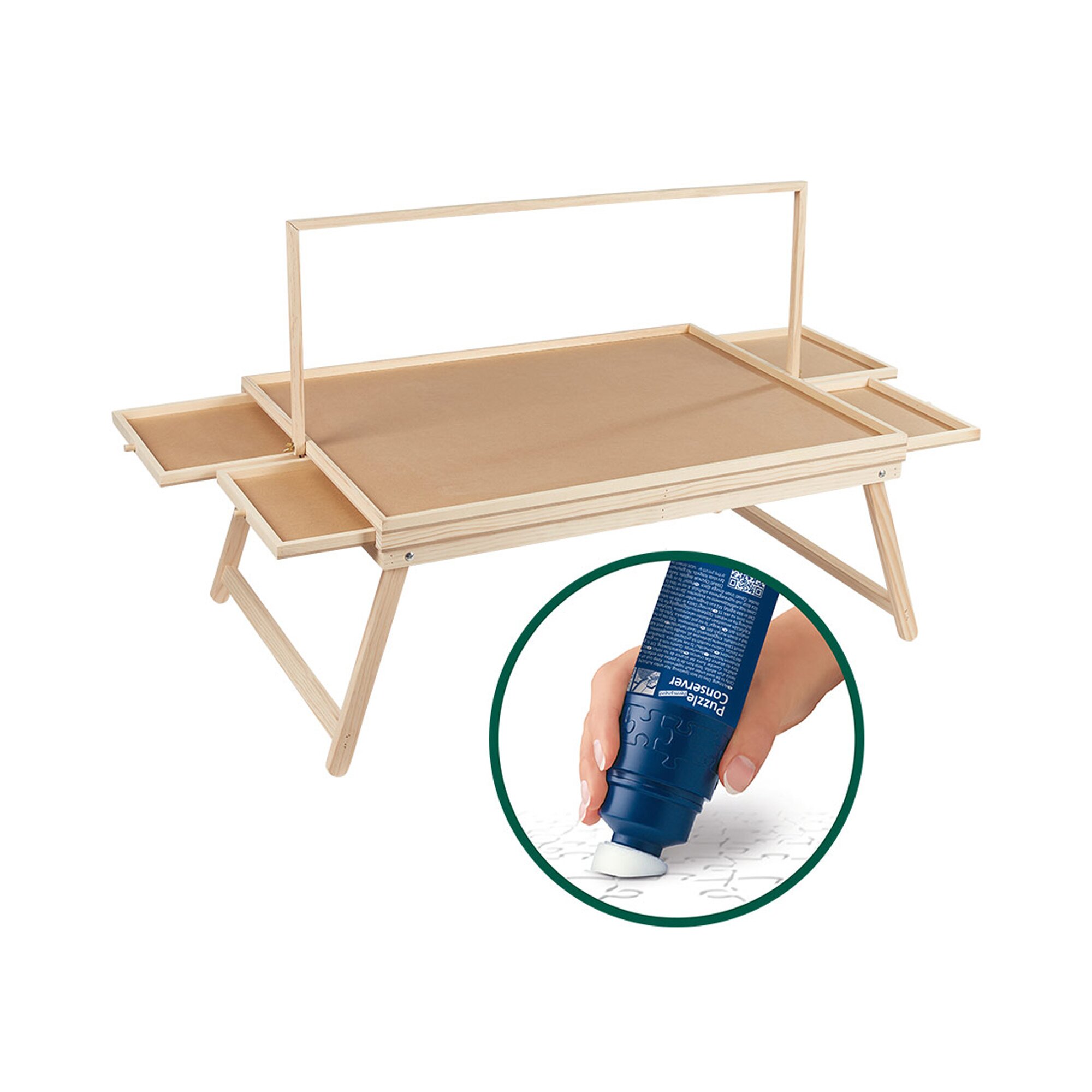 Mit dem Puzzletisch „Premium“ wird Puzzeln so komfortabel wie nie zuvor. Die klappbaren Beine machen den Tisch überall einsetzbar, egal ob Sie gemütlich auf dem Sofa, im Bett oder am Esstisch puzzeln möchten. Vier ausziehbare Schubladen bieten Ihnen die Möglichkeit, Puzzleteile übersichtlich zu sortieren und jederzeit griffbereit zu haben. Die verstellbare LED-Leiste sorgt für eine optimale Ausleuchtung, sodass Sie zu jeder Tageszeit perfekte Sicht auf Ihr Puzzle haben.Besonders praktisch: Sie können den Tisch mitsamt angefangenem Puzzle problemlos an einen anderen Ort tragen, ohne Teile wegräumen oder den Fortschritt verlieren zu müssen. So bleibt alles an seinem Platz und Sie können jederzeit flexibel weiterpuzzeln.Der beiliegende Puzzle-Kleber versiegelt Ihre fertigen Puzzles zuverlässig. Nach nur einer Stunde Trocknung ist Ihr Puzzle schleierfrei und dauerhaft fixiert, sodass es in brillanten Farben erhalten bleibt. Damit wird Ihr fertiges Puzzle zum dekorativen Kunstwerk, das Sie stolz in Ihrem Zuhause präsentieren können.