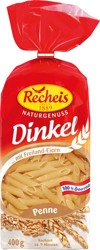 Teigwaren aus 100 % Dinkelgrieß mit Eiern aus Freilandhaltung Netto Füllmenge Nettogehalt 400.00 Gramm,Bruttogewicht 405.00 Gramm Allergene Enthält – Ist im Produkt enthalten Eier und -erzeugnisse,Glutenhaltiges Getreide sowie daraus hergestellte Erzeugnisse Aufbewahrung Bei trockener, vor Sonnenlicht geschützter Lagerung mindestens haltbar bis Ende: siehe Aufdruck Zutaten Zutaten: DINKELGRIESS, EIER (10 %), 2 Freilandeier je kg Dinkelgrieß. Nährwerte pro 100g Unzubereitet 100 Gramm, Energie 1.547,00 kJ, Energie 365,00 kcal, Fett 2,50 g, davon gesättigte Fettsäuren 0,60 g, Kohlenhydrate 71,00 g, davon Zucker 3,40 g, Ballaststoffe 2,90 g, Eiweiß 14,00 g, Salz 0,04 g Verwendung Sieden – Zubereitung der Speise in kochendem Wasser Kochanleitung: Nudeln in reichlich kochendes, gesalzenes Wasser geben (1 Liter/ 100 g Nudeln). Öfter umrühren. Nach ca. 9 Minuten sind die Nudeln bissfest gekocht. Hersteller Name: Recheis Teigwaren GmbH,Adresse: Fassergasse 8 – 10 6060 Hall in Tirol, Österreich,Webseite: www.recheis.at,Telefon: 0800/880999 (kostenfrei),Email: info@recheis.com