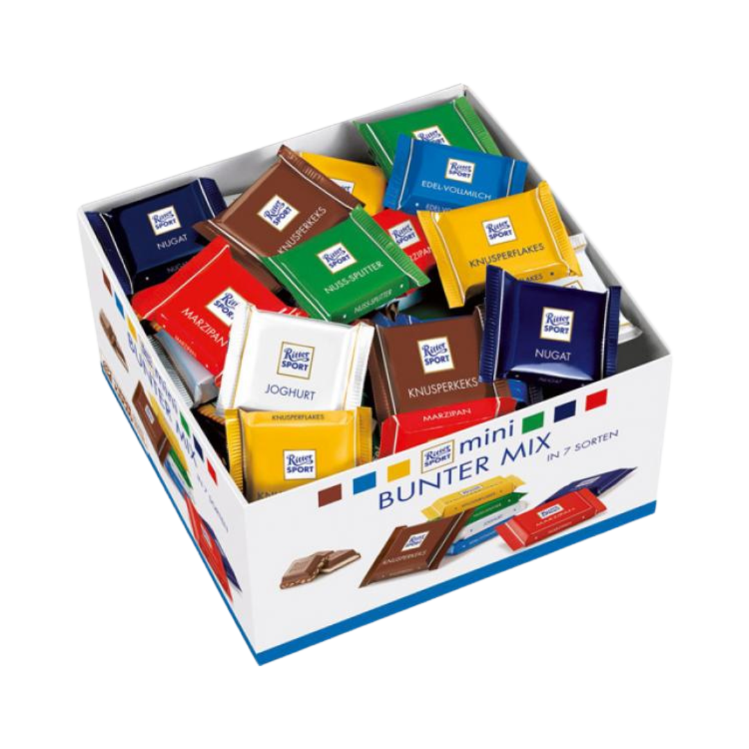 Schokolademischung: Edel-Vollmilchschokolade. Vollmilchschokolade mit Cornflakes (7%).Vollmilchschokolade mit Haselnuss-Stückchen (15%).Gefüllte Vollmilchschokolade mit Magermilch-Joghurt-Creme (44%).Gefüllte Vollmilchschokolade mit Nugat (42%). Gefüllte Vollmilchschokolade mit einer kakaohaltigen Creme (23%) und einem Butterkeks (12,5%).Gefüllte Halbbitter-Schokolade mit Edel-Marzipan (40%).Kakao: 30% mindestens in der Vollmilchschokolade.Kakao: 50% mindestens in der Halbbitterschokolade. Netto Füllmenge Bruttogewicht 1550.00 Gramm,Nettogehalt 1400.00 Gramm Allergene Kann Spuren enthalten von Eier und -erzeugnisse,Erdnüsse und -erzeugnisse,Enthält – Ist im Produkt enthalten Sojabohnen und -erzeugnisse,Glutenhaltiges Getreide sowie daraus hergestellte Erzeugnisse,Nüsse und Nusserzeugnisse. Kann Mandeln, Haselnüsse, Walnüsse, Cashewnüsse etc. einschliessen,Milch und Milcherzeugnisse Aufbewahrung Vor Wärme und Feuchtigkeit schützen. Zutaten Zutaten: Zucker, Kakaobutter, Kakaomasse, VollMILCHpulver, Palmfett*, LAKTOSE, MagerMILCHpulver, HASELNÜSSE (gehackt), BUTTERreinfett, HASELNUSSmasse, MagerMILCHjoghurtpulver, WEIZENmehl, MANDELN (gemahlen), Mais, Emulgator: Lecithine (SOJA), SAHNEpulver, Invertzuckersirup, BUTTER, WEIZENstärke, Salz, Glukose-Fruktose-Sirup, GERSTEnmalzextrakt, SüßMOLKEnpulver, Feuchthaltemittel: Invertase. *zertifiziert nachhaltig. Kann Spuren von Erdnüssen, anderen Schalenfrüchten und Ei enthalten. Nährwerte pro 100g Unzubereitet 100 Gramm, Energie 2.298,00 kJ, Energie 551,00 kcal, Fett 34,00 g, davon gesättigte Fettsäuren 19,00 g, Kohlenhydrate 53,00 g, davon Zucker 50,00 g, Eiweiß 6,90 g, Salz 0,22 g Ursprungsland DEUTSCHLAND, BUNDESREPUBLIK Hersteller Name: Alfred Ritter GmbH & Co. KG,Adresse: D-71111 Waldenbuch Deutschland