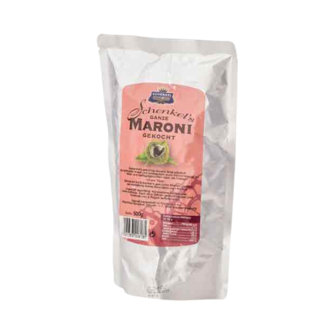 Schenkel Ganze Maroni gekocht, 500 Gramm Entdecken Sie das köstliche Aroma und den einzigartigen Geschmack unserer Schenkel Ganze Maroni – perfekt als schneller Snack oder als Beilage zu Wild- und Geflügelgerichten. Die Maroni werden gekocht und sind ungekühlt länger haltbar. Sie sind eine hervorragende Möglichkeit, um Ihrem Essen eine herbstliche Note zu verleihen. Schenkel Ganze Maroni sind einfach in der Zubereitung und verwendbar in einer Vielzahl von Gerichten. Sie sind eine hervorragende Ergänzung für Ihren Speiseplan und ihre Verwendungsmöglichkeiten sind grenzenlos. Die Maroni eignen sich hervorragend als Dessert oder als kleine Nascherei zum Kaffee. Sie können auch als zutaten in eine Vielzahl von Gerichten wie Suppen, Eintöpfen oder Salaten verwendet werden. Unsere Schenkel Ganze Maroni werden in Frankreich hergestellt und sind glutenfrei. Die Maroni sind ungekühlt längerhaltbar und können auch nach dem Öffnen für bis zu 5 Tage im Kühlschrank aufbewahrt werden. Sie können also jederzeit einen schnellen Snack oder eine tolle Beilage zu Ihrem Gericht genießen. Probieren Sie unsere Schenkel Ganze Maroni gekocht und entdecken Sie, wie einfach und köstlich es sein kann, Ihrem Essen eine herbstliche Note zu verleihen. Bestellen Sie jetzt und entdecken Sie die vielseitigen Anwendungsmöglichkeiten dieses köstlichen Snacks. Ganze Maroni gekocht Köstlich als schneller Snack und schmecken auch hervorragend zu Wild- und Geflügelgerichten oder als Dessert. Netto Füllmenge Nettogehalt 500.00 Gramm,Bruttogewicht 510.00 Gramm Allergene Aufbewahrung Ungekühlt lagerfähig. Mindestens haltbar bis: siehe Aufdruck. Nach dem Öffnen gekühlt lagern und innerhalb von 5 Tagen aufbrauchen. Nährwerte pro 100g Unzubereitet 100 Gramm, Energie 168,00 kcal, Energie 709,00 kJ, Fett 1,70 g, davon gesättigte Fettsäuren 0,40 g, Kohlenhydrate 33,00 g, davon Zucker 8,00 g, Eiweiß 2,60 g, Salz 0,01 g Ursprungsland FRANKREICH Verwendung Unser Tipp: Servieren Sie Schenkel´s gekochte Maroni glasiert als herbstliche kleine Nascherei zum Kaffee. Hersteller Name: Importhaus Schenkel,Adresse: Inkustr. 1-7, 3400 Klosterneuburg