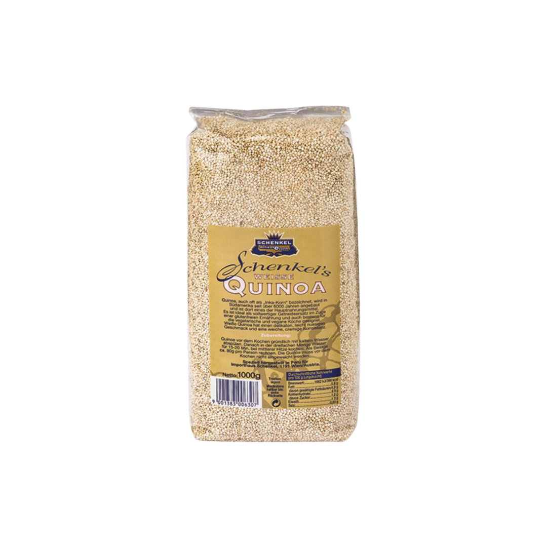 Schenkel Quinoa weiß Weisse Quinoa Quinoa, auch oft als „Inka-Korn“ bezeichnet, wird in Südamerika seit über 6000 Jahren angebaut und ist dort eines der Hauptnahrungsmittel. Es ist ideal als vollwertiger Getreideersatz im Zuge einer glutenfreien Ernährung und auch bestens für die vegetarische und vegane Küche geeignet. Weisse Quinoa hat einen delikaten, leicht nussigen Geschmack und eine weiche, cremige Konsistenz. Netto Füllmenge Nettogehalt 1000.00 Gramm,Bruttogewicht 1005.00 Gramm Allergene Aufbewahrung Trocken lagern Nährwerte pro 100g Unzubereitet 100 Gramm, Energie 1.662,00 kJ, Energie 398,00 kcal, Fett 5,80 g, davon gesättigte Fettsäuren 4,00 g, Kohlenhydrate 69,00 g, davon Zucker 1,00 g, Eiweiß 13,00 g, Salz 0,03 g Ursprungsland PERU Verwendung Sieden – Zubereitung der Speise in kochendem Wasser Quinoa vor dem Kochen gründlich mit kaltem Wasser abspülen. Danach in der dreifachen Menge Wasser für 15-20 Min. bei mittlerer Hitze kochen. Als Beilage ca. 80g pro Person rechnen. Die Quinoa muss vor dem Kochen nicht eingeweicht werden. Hersteller Name: Importhaus Schenkel,Adresse: 1191 Wien/Austria,Email: info@schenkel.at