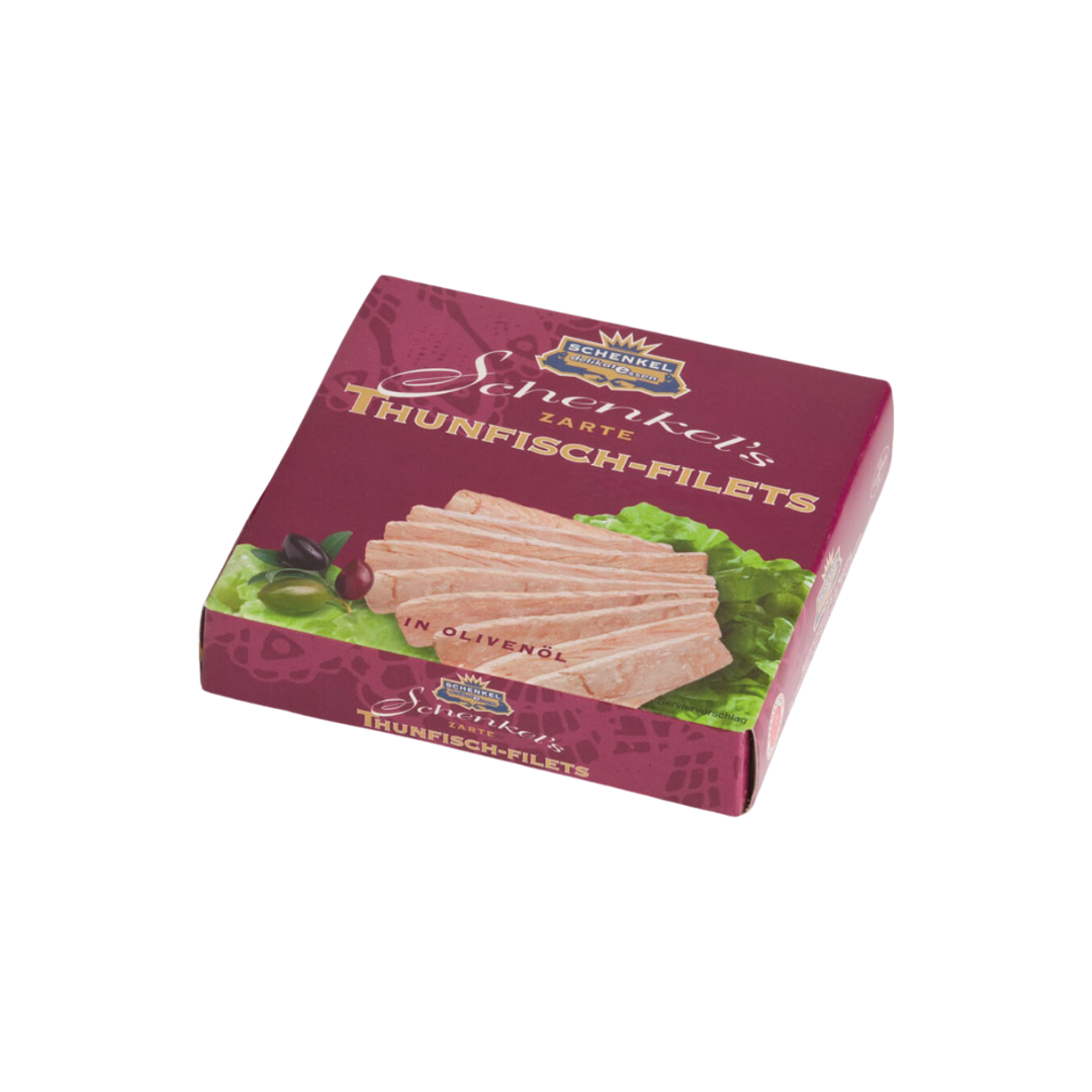 Schenkel Thunfischfilets in Olivenöl, 110g Entdecken Sie unsere köstlichen Schenkel Thunfischfilets in Olivenöl, geschnittene Thunfischfilets von höchster Qualität. Diese exquisiten Bauchfilets zeichnen sich durch saftiges Fleisch, zart-mürbe Konsistenz und einen äußerst feinen Geschmack aus. Hinzu kommt, dass sie in natives Olivenöl extra eingelegt werden. Jede Dose enthält 110 Gramm feine Thunfischfilets im Glas, die einzeln von Hand in Olivenöl eingelegt werden, um ihre hervorragende Qualität und ihren Geschmack zu bewahren. Schenkel's Thunfisch-Filets sind vielseitig einsetzbar und eine hervorragende Zutat für Ihre kulinarischen Kreationen. Ob als Salat-Topping oder als Zutat für Ihr nächstes Gericht – mit unserem Schenkel Thunfisch werden Sie Ihre Gäste beeindrucken. Probieren Sie jetzt unseren Schenkel Thunfisch in Olivenöl und genießen Sie den Geschmack von bestem Thunfisch aus einer nachhaltigen Fischerei. Bestellen Sie noch heute und erleben Sie die Aromen Spaniens in Ihrer Küche. Geschnittene Thunfischfilets in Olivenöl Als „Filetes de Ventresca“ werden nur die edelsten Stücke des Thunfischs bezeichnet. Die exquisiten Bauchfilets zeichnen sich durch saftiges Fleisch, zart-mürbe Konsistenz sowie äußerst feinen Geschmack aus. Von Hand in natives Olivenöl extra eingelegt. Netto Füllmenge Abtropfgewicht 72.00 Gramm,Nettogehalt 110.00 Gramm,Bruttogewicht 183.00 Gramm Allergene Enthält – Ist im Produkt enthalten Fisch und -erzeugnisse Aufbewahrung Ungekühlt lagerfähig. Nach dem Öffnen gekühlt lagern und innerhalb von 24 Stunden aufbrauchen. Zutaten Zutaten: THUNFISCHFILETS (Thunnus albacares*) 65%, Natives Olivenöl extra, Salz. *Gefangen mit Haken und Langleinen. Fanggebiet: siehe Seitenlasche. Nährwerte pro 100g Unzubereitet 100 Gramm, Energie 187,00 kcal, Energie 782,00 kJ, Fett 9,20 g, davon gesättigte Fettsäuren 1,10 g, Kohlenhydrate 0,00 g, davon Zucker 0,00 g, Eiweiß 26,00 g, Salz 0,95 g Ursprungsland SPANIEN Verwendung Salat Nicoise: blattsalat nach Wahl, Tomaten und Gurken waschen. Grüne Fisolen in Salzwasser kernig kochen, dann kalt abschrecken. Tomaten und Gurken schneiden. Eine Marinade aus Olivenöl, Weinessig, Salz und Pfeffer zubereiten. Alle Zutaten zusammein in eine Salatschüssel geben und marinieren. Die Portionen auf Tellern anrichten. Zwiebel in Ringe schneiden und zusammen mit Oliven auf dem Salat verteilen. Thunfischfilets aus der Dose nehmen und auf dem Salat drapieren. Thunfisch-Cocktail: Salatblätter nach Wahl waschen, trocken tupfen und auf Tellern anrichten. Mit Cocktailsauce überziehen, dann die abgetropften Filets fächerförmig oben auflegen. Mit Oliven garnieren. Dazu Weißbrot reichen. Hersteller Name: Importhaus Schenkel,Adresse: Inkustr. 1-7, 3400 Klosterneuburg