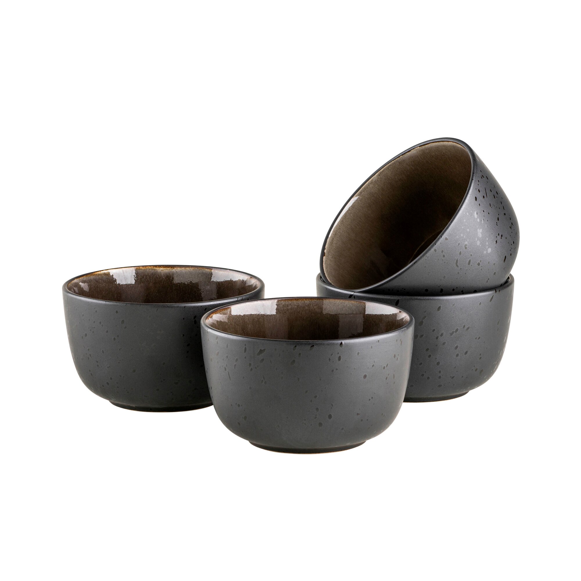 Die unvergleichliche Keramikgeschirr-Serie „Niara“ der österreichischen Traditionsmarke Mäser verbindet auf einzigartige Weise selbstbewusste skandinavische Formen mit zwei unterschiedlichen Glasurtechniken: Auf den Ober- bzw. Innenseiten der Geschirrteile fließen strahlende Farbschattierungen auf schwarzem Untergrund zu wunderbaren Maserungen zusammen. Die Außen- bzw. Unterseiten hingegen bestechen durch eine Mattglasur in Schwarz, welche mit glänzenden schwarzen Sprenkeln überzogen wurde. Durch die händisch aufgetragenen Farben ist jedes Teil in dieser Kollektion auf allen Seiten einzigartig gemustert. Mit ihrem exquisiten und individuellen Charakter ist die Kollektion „Niara“ ein echter Hingucker auf jedem Esstisch. Gefertigt aus langlebigem, hochwertigem Steinzeug (welches nicht mit dem deutlich brüchigeren Steingut zu verwechseln ist) wird Ihnen dieses Geschirrset lange Freude bereiten. Selbstverständlich ist die gesamte Serie „Niara“ mikrowellen- und spülmaschinengeeignet. Dieses Set wird in einer vielfach auf Bruchsicherheit getesteten Paketversandverpackung aus nachhaltigen Materialien versendet. Bitte beachten Sie: Diese Kollektion wird händisch lasiert, wodurch minimale Unebenheiten der Glasur, kleine Einschlüsse und leichte Farbabweichungen auftreten können. Zur besseren objektiven Vergleichbarkeit gehen unsere Füllmengenangaben von einer randvollen Befüllung aus.Dieses Set besteht aus: Schüssel 13,8 cmFarbe: Schwarz / GrauAnzahl: 4Ausführung: MüslischaleGröße: 14,8Material: SteinzeugPersonenanzahl: 4Serie: NiaraVerzierungsfarbe: Farbig ohne Dekor