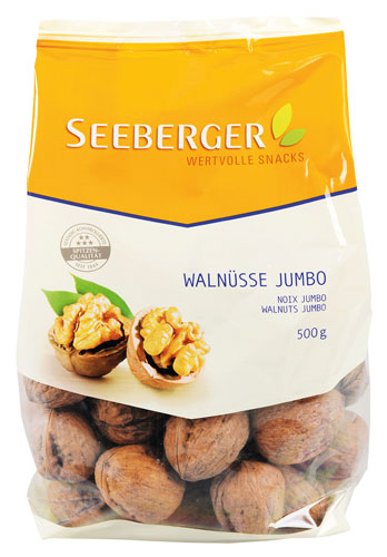 Walnüsse Jumbo Unter Schutzatmosphäre verpackt. Netto Füllmenge Nettogehalt 500.00 Gramm,Bruttogewicht 512.20 Gramm Allergene Aufbewahrung Nach dem Öffnen bitte kühl und trocken lagern! Nährwerte pro 100g Unzubereitet 100 Gramm, Energie 2.805,00 kJ, Energie 679,00 kcal, Fett 63,00 g, Kohlenhydrate 11,00 g, Eiweiß 14,00 g Gütezeichen Unter Schutzatmosphäre verpackt. Hersteller Name: Seeberger KG,Adresse: D-89025 Ulm, Deutschland,Email: info@seeberger.de