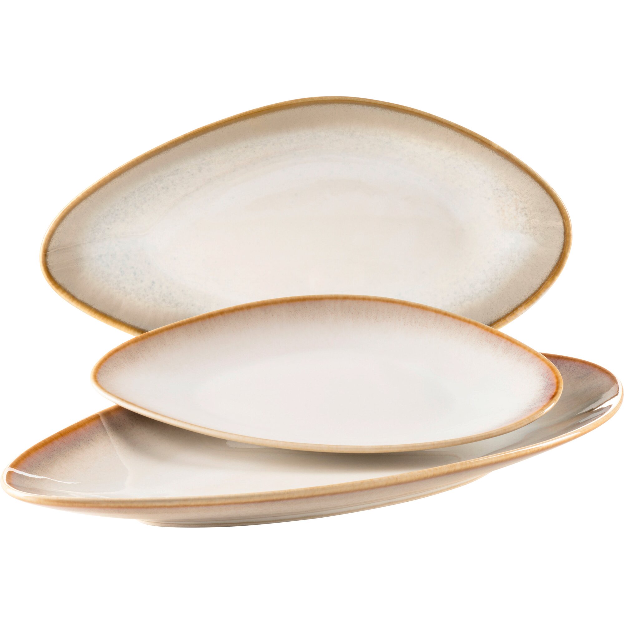 Die Tafelgeschirr-Serie „La Sinfonia“ der österreichischen Traditionsmarke Mäser ist das Ergebnis eines perfekt orchestrierten Zusammenspiels außergewöhnlicher Nierenformen, graziler Dekoration und exzellenter Materialqualität. Erstaunen Sie Ihre Gäste mit dieser ganz besonderen, modernen Steinzeug-Geschirr-Kollektion, in der dank des hohen handwerklichen Anteils beim Glasurvorgang kein Teil exakt wie das andere aussieht. Jedes Set wird in einer sicheren Paketversandverpackung aus nachhaltigen Materialien versendet.Dieses Serviergeschirr besteht aus:1 x Platte oval 22,5 x 11,6 cm1 x Platte oval 27,6 x 14,3 cm1 x Platte oval 32,6 x 17,3 cmFarbe: BeigeAnzahl: 3Material: SteinzeugPersonenanzahl: 4Serie: LA SINFONIAVerzierungsfarbe: Farbig ohne Dekor