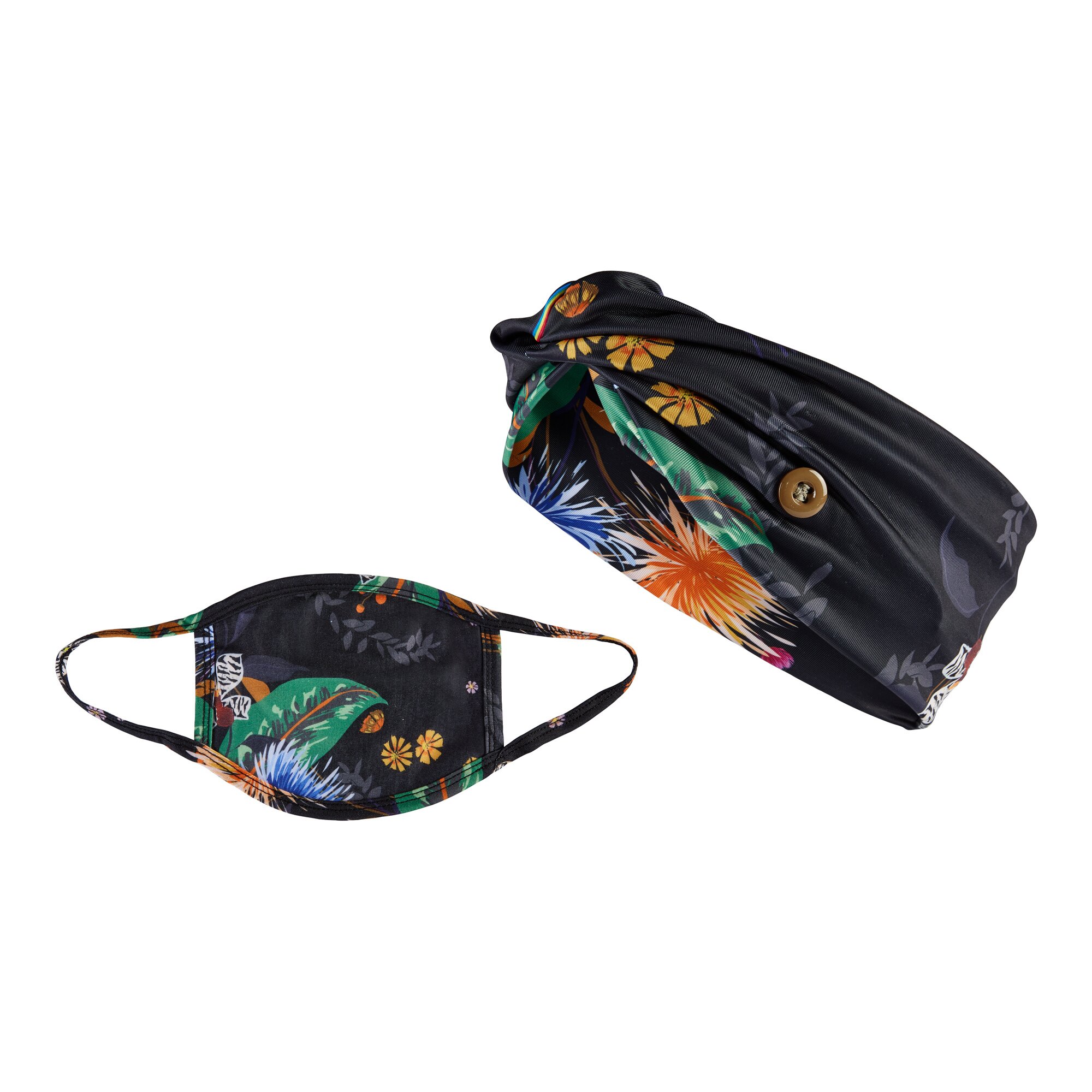 Elastisches Stirnband mit seitlichen Knöpfen zur Befestigung der Maskenbänder. Druckstellen können somit verhindert werden. Ideal für Brillenträger. Einheitsgröße. Mund- und Nasenbedeckung mit Seitenöffnung für Filter. Material: Mund- und Nasenbedeckung Vorderseite: 95 % Polyester, 5 % Elasthan Mund- und Nasenbedeckung Rückseite: 95 % Baumwolle, 5 % Elasthan Maskenstirnband Material: 95 % Polyester, 5 % Elasthan